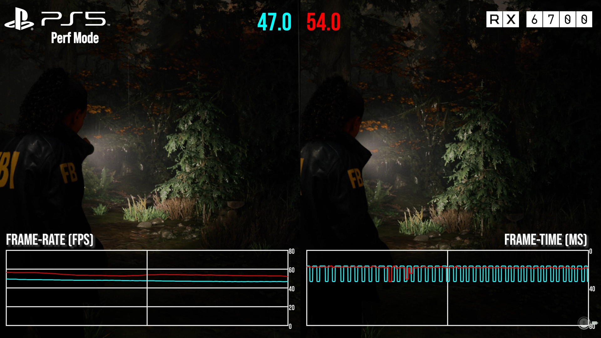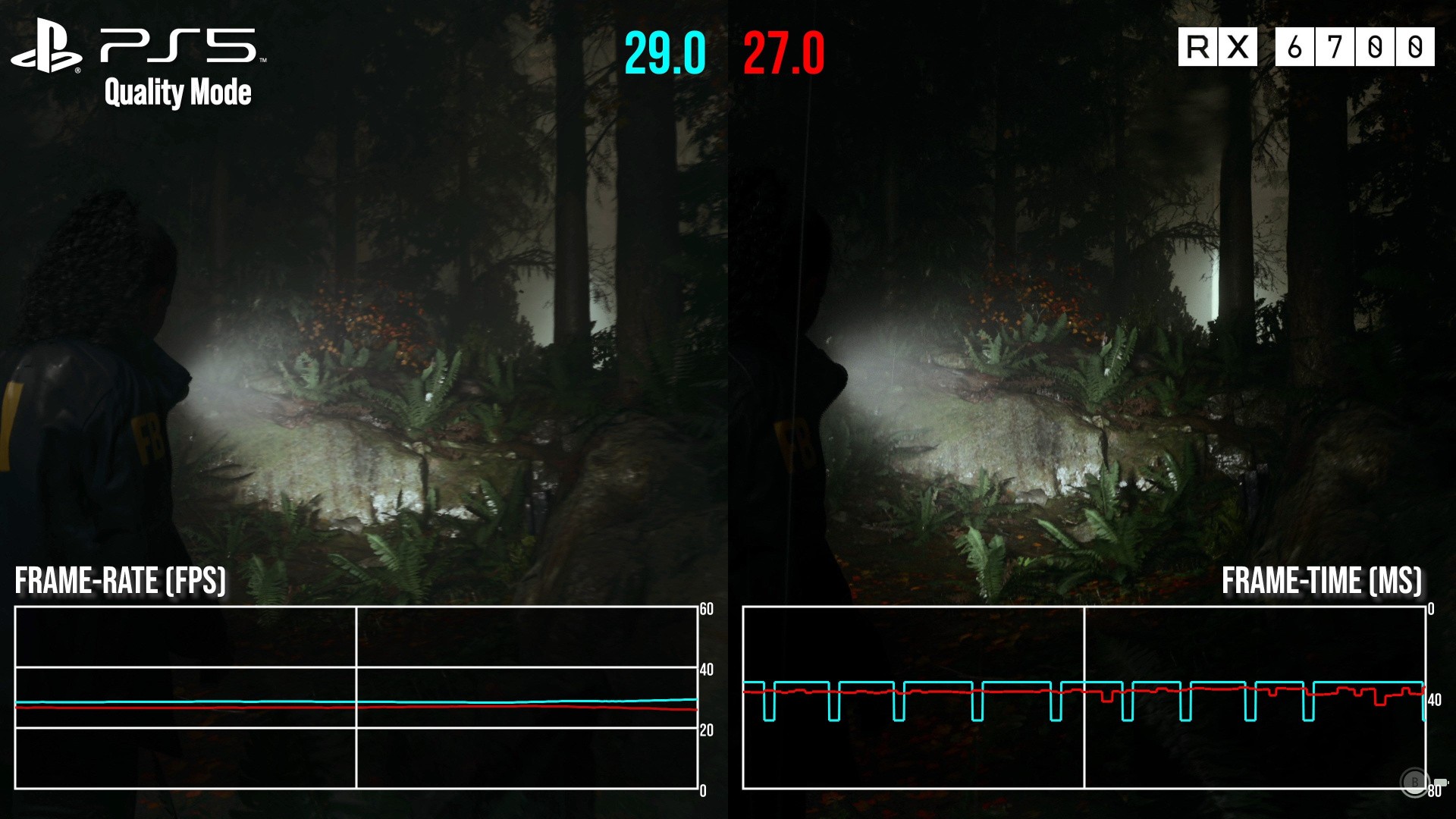 Alan Wake 2 offers quality and performance modes and again, finding a stress point in the forest sees both modes drop beneath their frame-rate targets on PS5. In the quality mode, it's another six percent performance differential, but this time it's in favour of the PlayStation 5. Of course, we can run through this sequence again with the lower quality performance mode - lower settings, lower resolution, higher frame-rates - but this time it's the 6700 that takes point with a 10.8 percent lead.