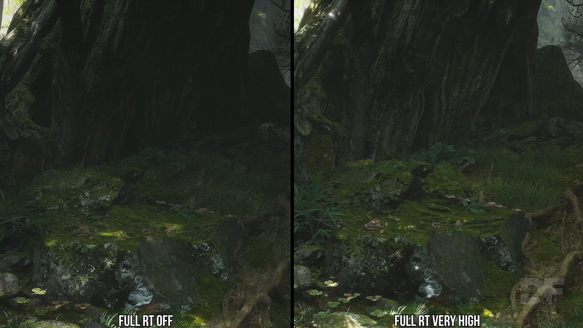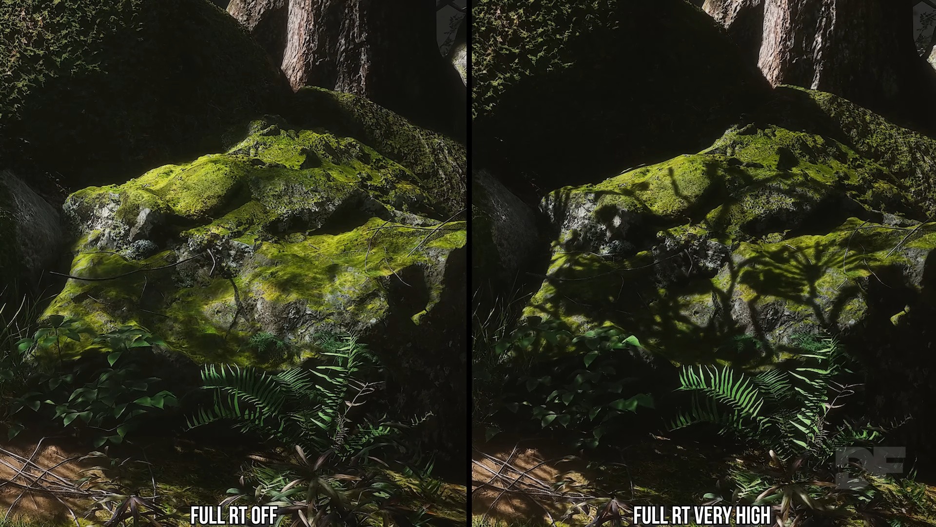The full RT setting enhances the lighting further, with improvements to the diffuse lighting seen on rougher surfaces. As the full RT path utilises very high-quality geometry instead of signed distance fields (SDFs), it can show off more fine detail like smaller plants or leaves that are otherwise only captured in screen-space and therefore can look monotone in shading or somewhat undershaded. With full RT, nearly all of the fine detail geometry is there and being ray traced against, so you will see fine detail shadowing or bounce lighting within such plants, making them better situated in their surroundings for a higher-fidelity final look. If you take the time to breathe in the environments, this is a great addition.