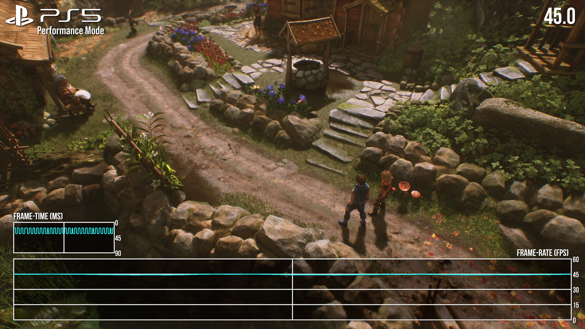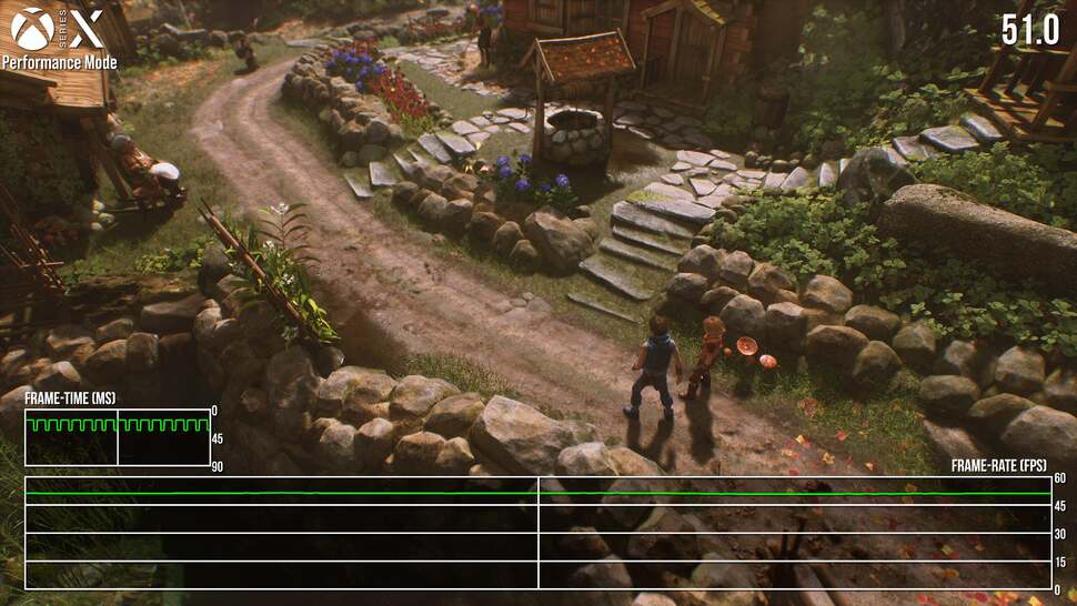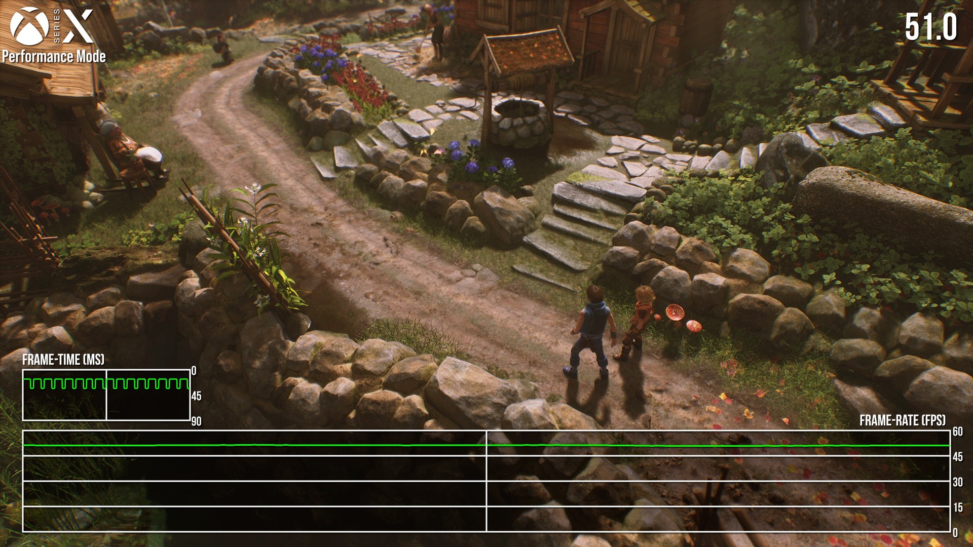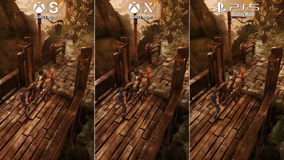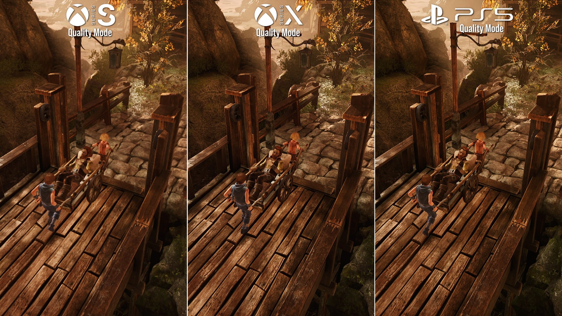 These visual cutbacks make the 30fps quality mode the sensible default choice on any platform, especially as this runs with even frame pacing and a locked 30fps on PS5 and Series X - and a nearly locked 30fps on Series, with only one segment on Series S that drops into the mid-20s. There are minor hitches on all platforms when the game auto-saves, but this is only mildly distracting rather than game-breaking. 60fps purists will no doubt have a bone to pick here, but Brothers is a slower-paced game that doesn't tend to feature timing-sensitive inputs. Also, despite the heavy visual compromises on Series S - in resolution, shadows and ambient occlusion - they do at least pave the way for solid frame-rate on that quality mode.