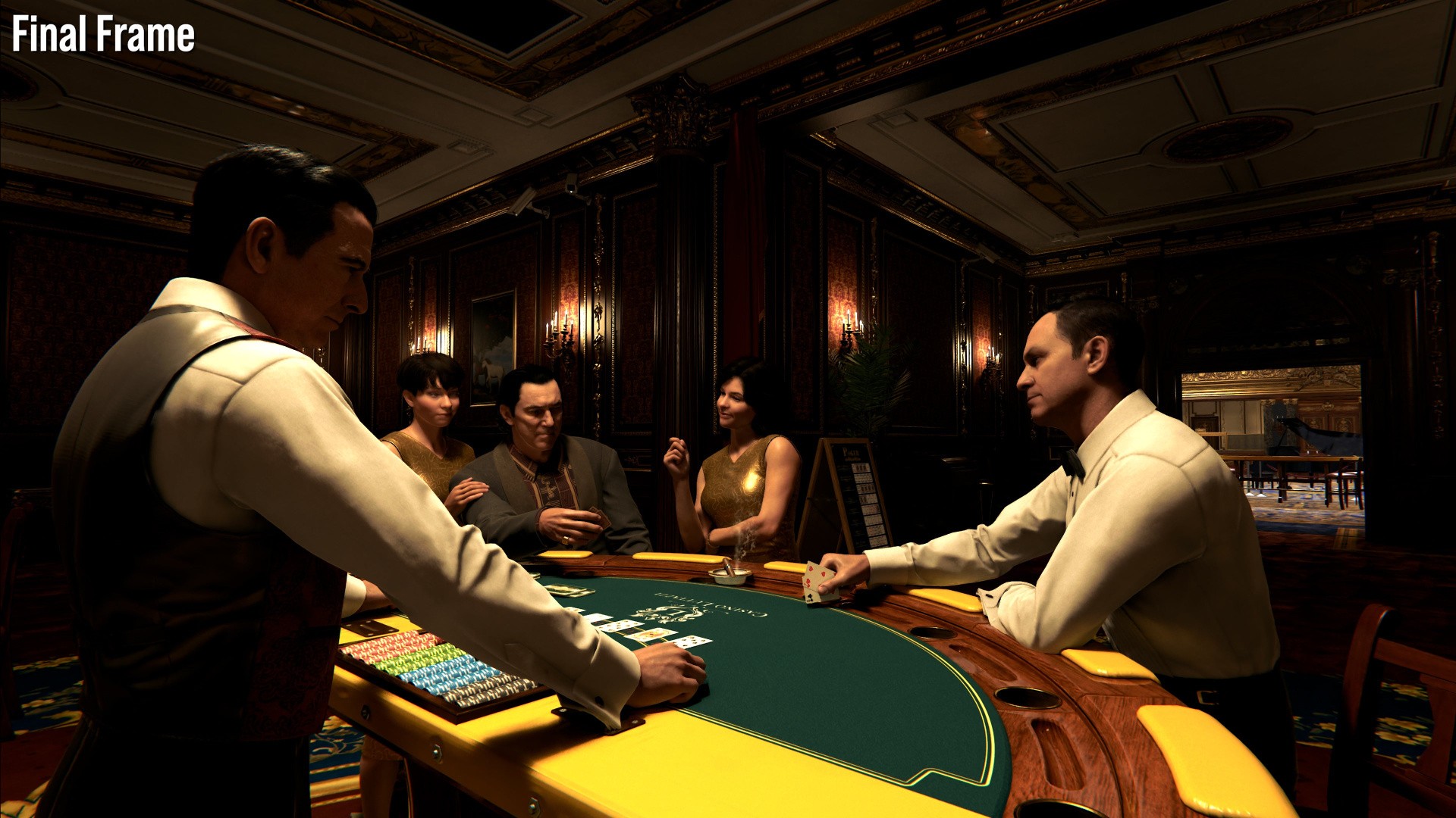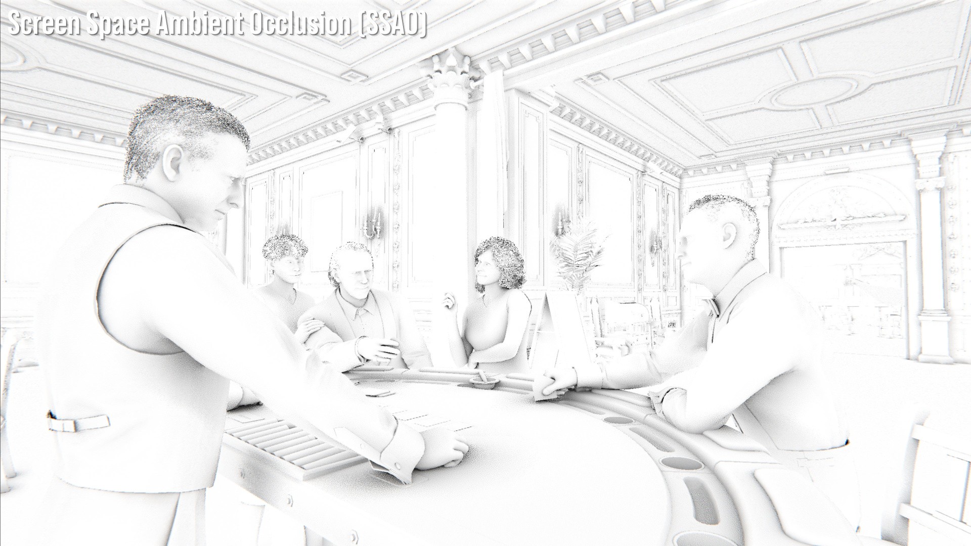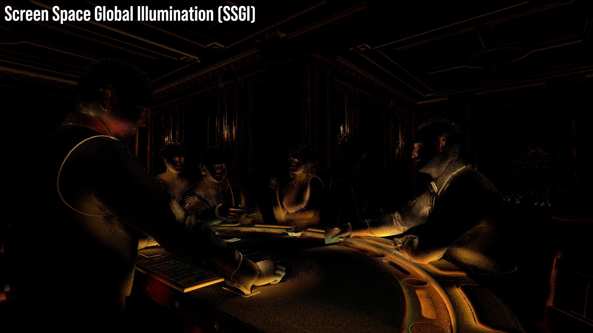 This SSGI setting is something the team is especially proud of, as a rasterised technique that attempts to mimic the quality of path tracing. It's calibrated to create as comparable a result to the team's internal, path traced reference, though obviously at a fraction of the cost. This also extends to the way ambient shade is implemented. With the improved SSAO on Pro, there's a richer bed of shade added to the scene - and most interior shots like the headquarters - creating a more life-like final frame.
