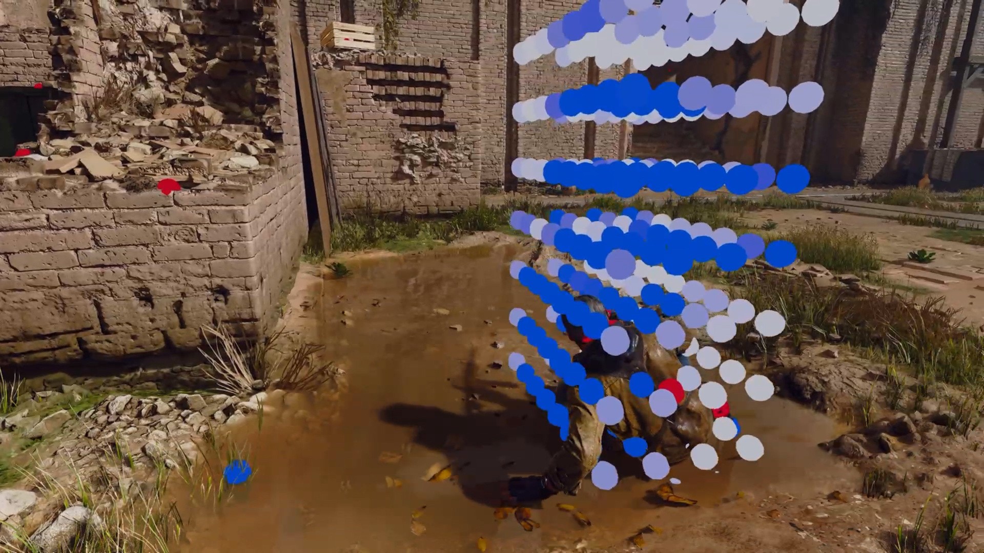 Among the many new additions to the game is weather grade volumes - or WGVs. In a nutshell, WGVs allow mud, water, oil, or snow to leave a persistent mark on a player's body - with only the specific body part coming into contact being affected. It's best shown off in third person view, though in practise you'll see it on enemies during gameplay. One great dev footage example sent by the team has a player stood next to a 4x4 vehicle; the acceleration of the rear wheels causes mud to spray upwards, where the momentum of the car, and the velocity of the spray is simulated by large spherical volumes. These WGVs constantly adjust and change based on the position, and then, to measure the point of that mud's impact on the player, a 3D voxel-based system is used on the player.