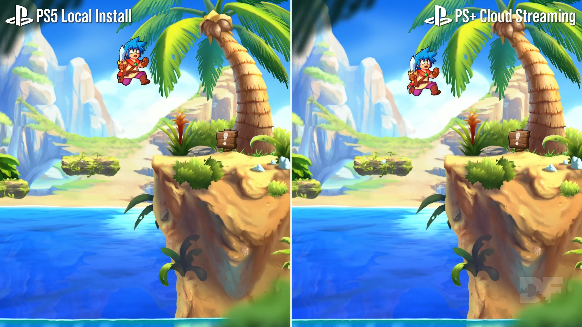 So how does image quality over the the PS Plus cloud stack up to the real thing? Truth be told, Sony's service has a wide range of results on this front, based on your internet connection and the game content itself. In my case, I'm using a BT FTTC (fibre to the cabinet) connection with 70Mbps download and 20Mbps upload - more than enough bandwidth for a 4K stream. It's worth stressing that any contention on the line - like others on the network watching Netflix or YouTube - may decrease image quality or introduce hitching to the stream. Your choice of game also has an impact: simpler 2D games with flat-shaded shapes and lots of primary colours like Monster Boy are less challenging to stream without image degradation - and in practise are indicernible from playing a true PS5 install. By comparison, more realistic 3D games with areas of high contrast and movement like Cyberpunk 2077 show more issues: fine detail is clearly degraded, while darkened areas smudge over with compression.