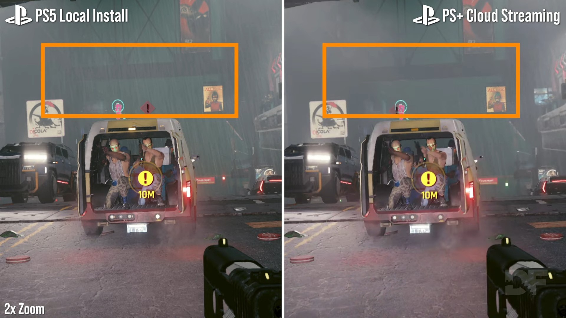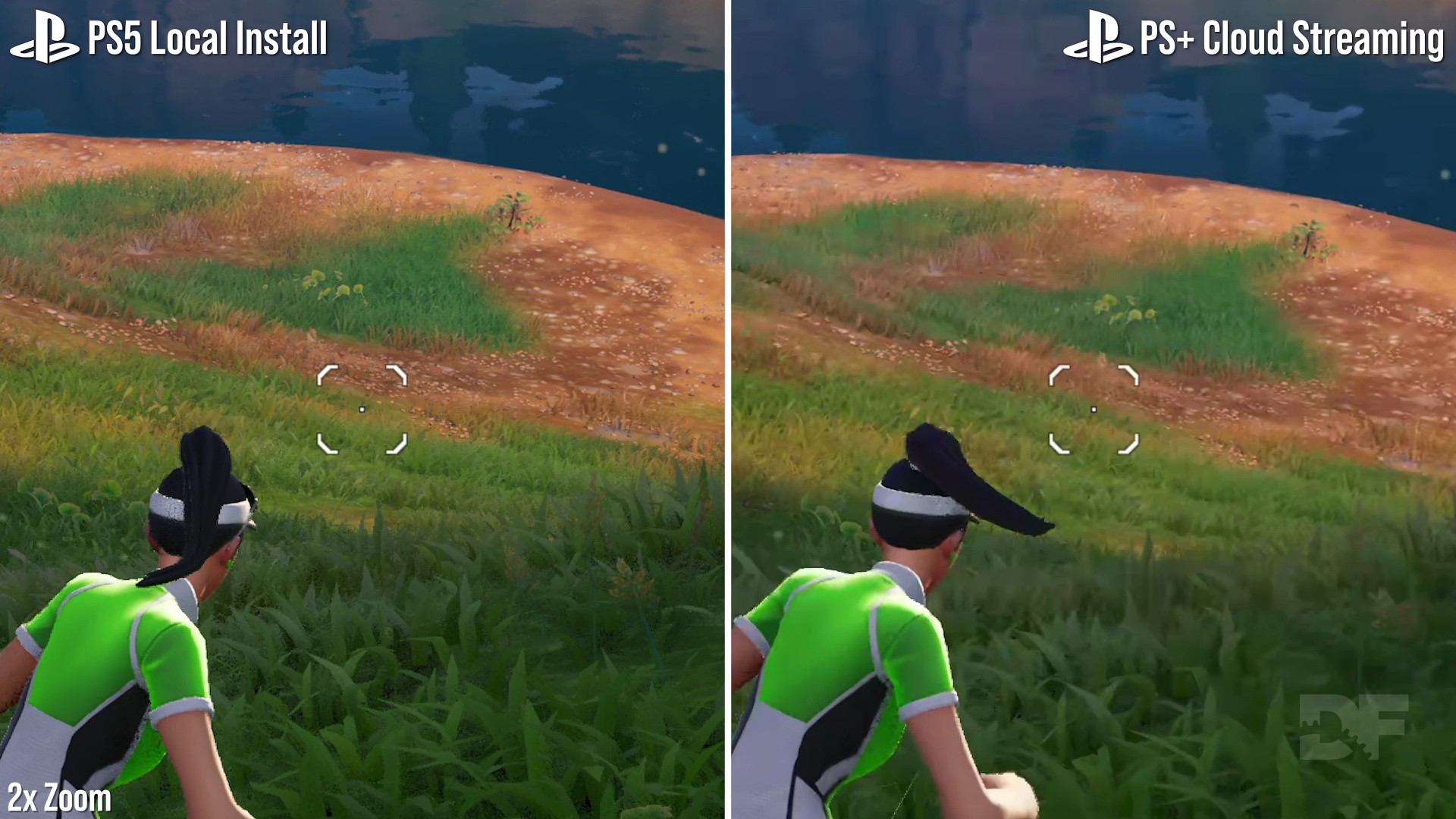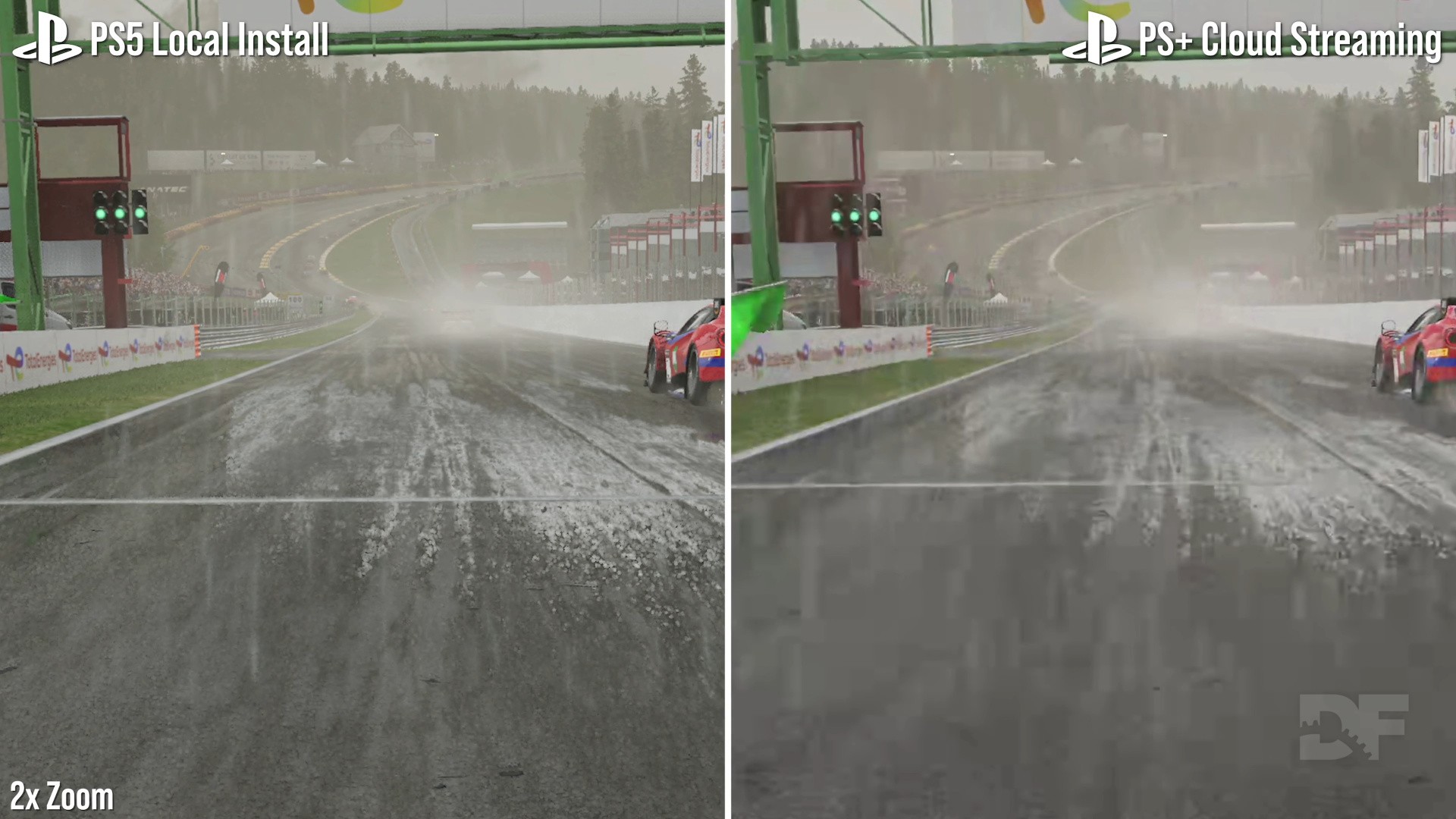 Looking at a more moderate case like Fortnite - running at 60fps in a matched test - the cloud version almost passes as the real thing but there are clear limits imposed by the video encoder. In the worst case, areas of dense green foliage again cause video breakup, smudging over the definition of grass blades. Pushing things to a further extreme, Assetto Corsa Competizione is something of a worst-case scenario for cloud streaming tech. Typically, racing sims of this nature demand high levels of video bandwidth when presented in video. And so it goes here: in comparing a saved race replay running natively on PS5 versus the cloud solution, the grey overcast sky, rainfall and rapid 60fps movement cause heavy macro-blocking across each frame. In this specific case, it's very hard to recommend PS Plus streaming as an alternative to the real thing.