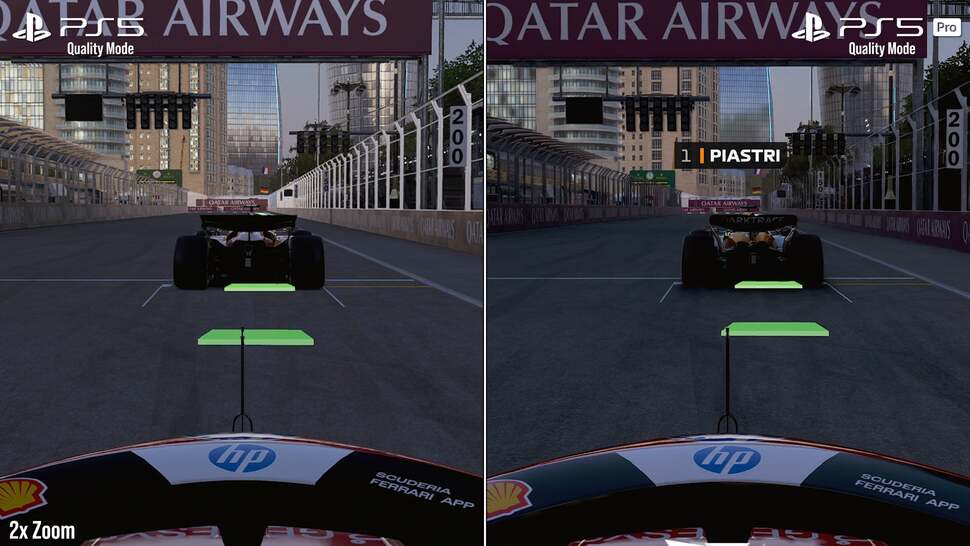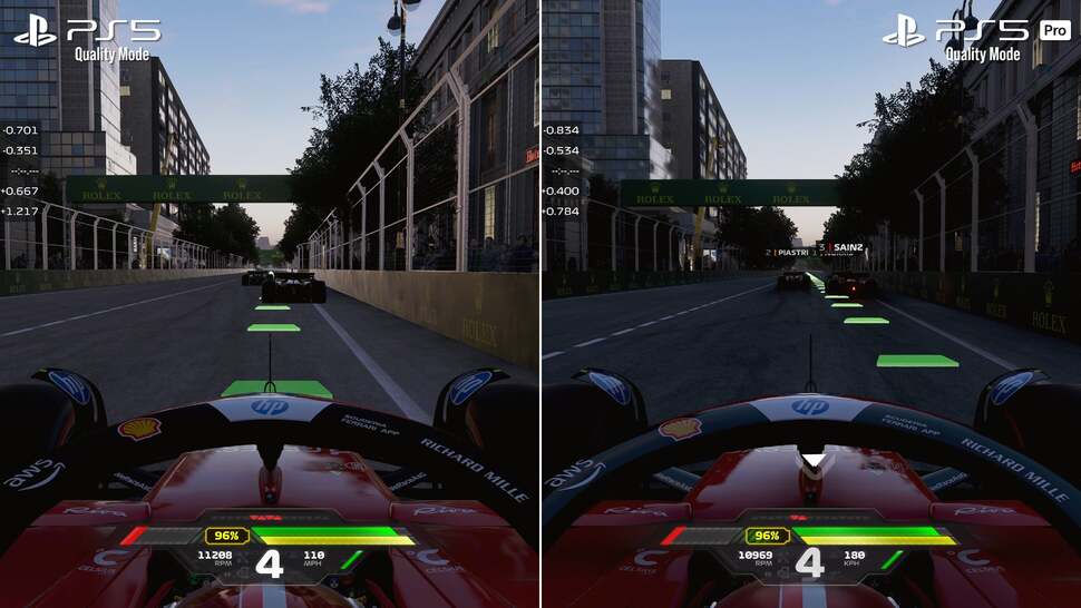 Next along is the impact of ray traced ambient occlusion - the indirect shading in and around the car and track. The underside of the car has a more realistic, deeper blanket of shade and even trackside detail is more accurately shaded. Racing through the Azerbaijan circuit around dusk, the waning sunlight is better simulated with PS5 Pro's RTAO: its barriers are darkened all the way up the initial strait, while the base model's details look almost artificially bright. There's an altogether richer, more natural pass of shade that beds in every point of the track ahead, and even cockpit details.