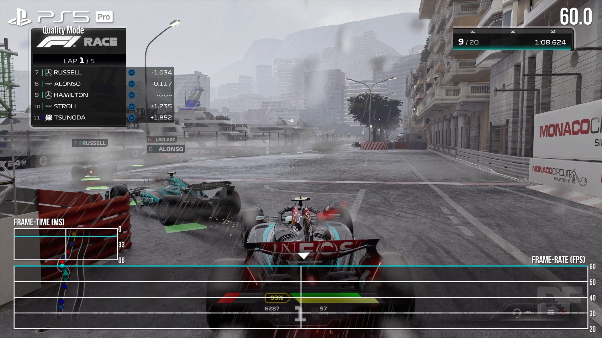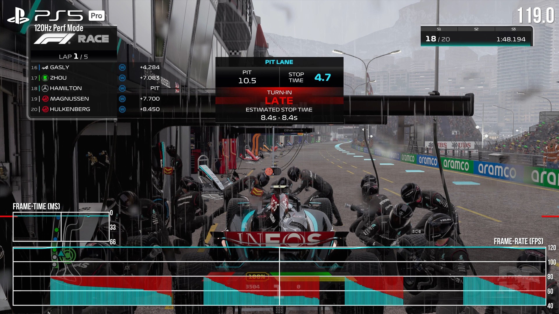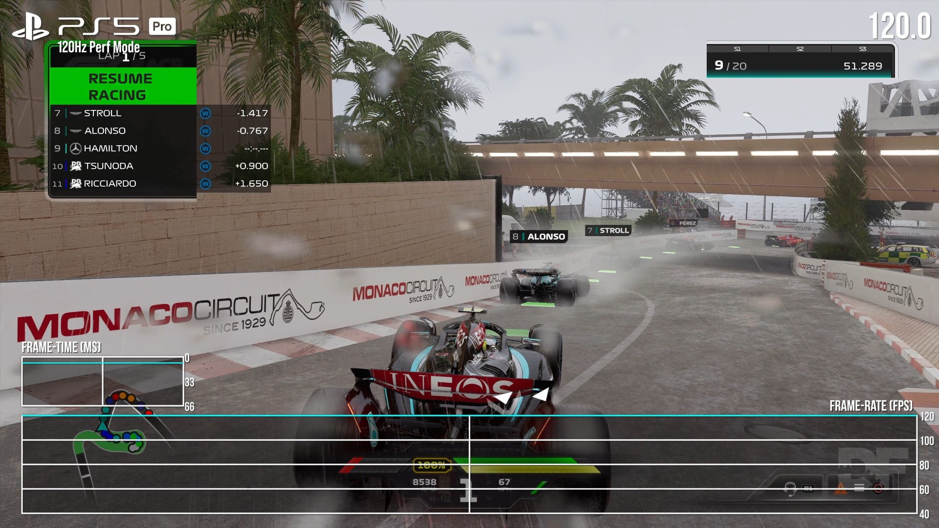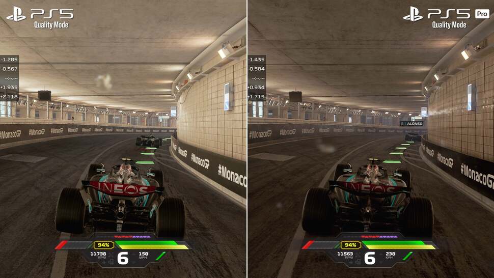 Testing PS5 Pro's frame-rate at 120fps, the turnout is capably hits the mark. On every track tested so far there's barely a blip en route, even including the Monaco circuit as our extreme stress test. That said, there are some exceptions. Turning into a pitstop for repairs triggers a minor bout of frame drops - to 115fps lowest, with full-screen tearing. There's also very occasional one frame drops during gameplay, but nothing that massively detracts from the experience. And once again, performance mode has an odd set of behaviours during pre-race sequences and replays. Generally these lock at a 40fps cap much like the quality mode (and 40fps makes much more sense with 120Hz as the output here), but ending or retiring from a race triggers the engine to run fully unlocked to 120 frames per second. Much like base PS5, these automated, post-race moments engage ray tracing for ambient occlusion, reflections and DDGI. The net result is, we get to see - even if just briefly - how PS5 Pro would run with these RT technologies with a 120fps target. The reality is that we're hovering at the 70-90fps range, and that being the case, disabling these options for gameplay itself seems a sensible call.