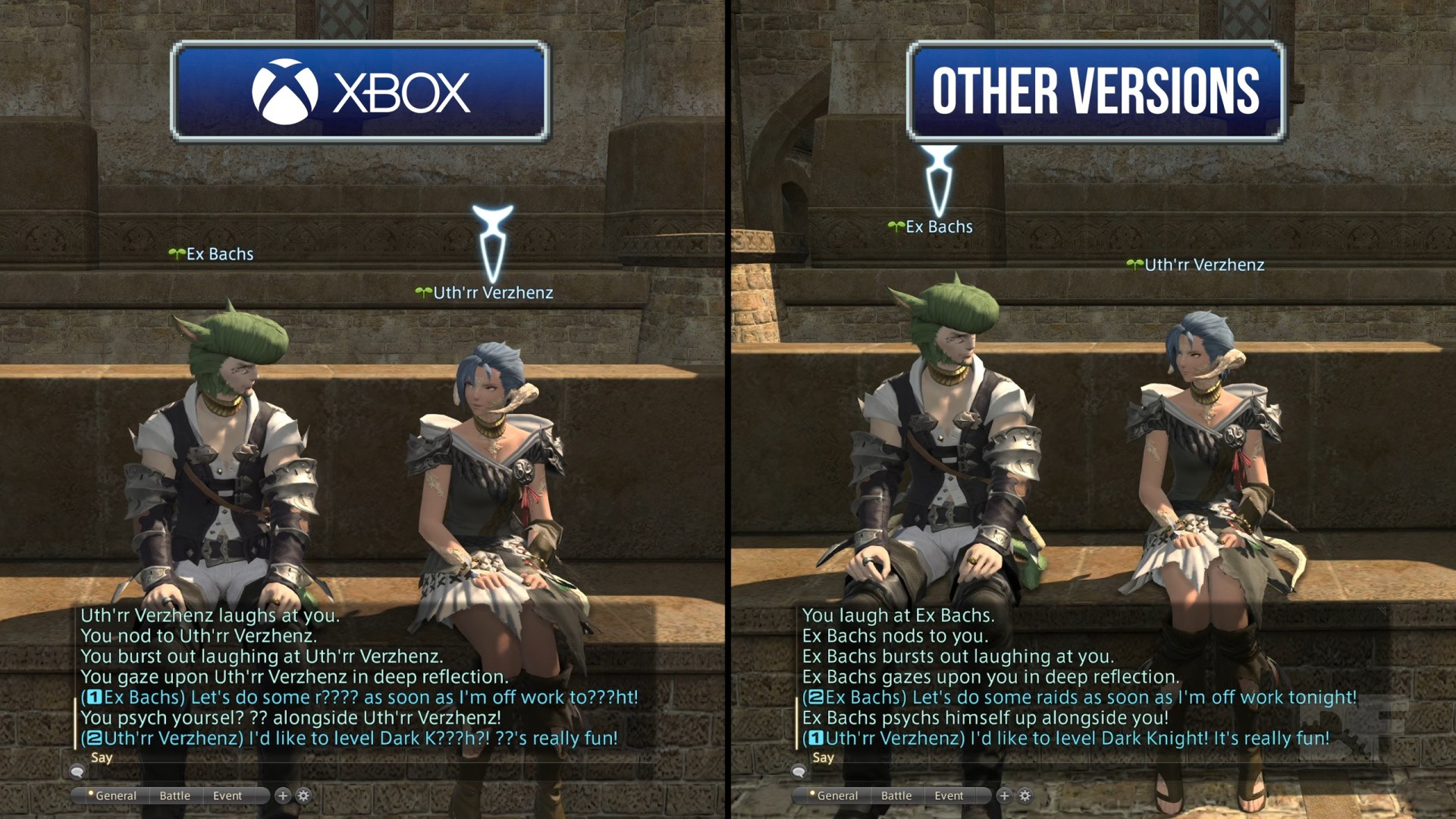 Another Xbox-specific issue regards the over-active profanity filter in the chat log - which seems a requirement to be on the Xbox platform rather than the in-game setting, which works independently. The filter doesn't just replaced offensive words with question marks, it also affects any string of forbidden letters within innocuous words - and even across adjacent words and sentences. This even applies to NPCs and system text, like emote descriptions, which is laughable. That means that figuring out what the game or your teammates are trying to say can require thinking about what offensive words might fit in the gaps - or even learning some new ones. It goes without saying that this is a silly state of affairs for a social game like an MMO, and needs both public acknowledgement of the issue by Microsoft or Square Enix - and a proper fix.