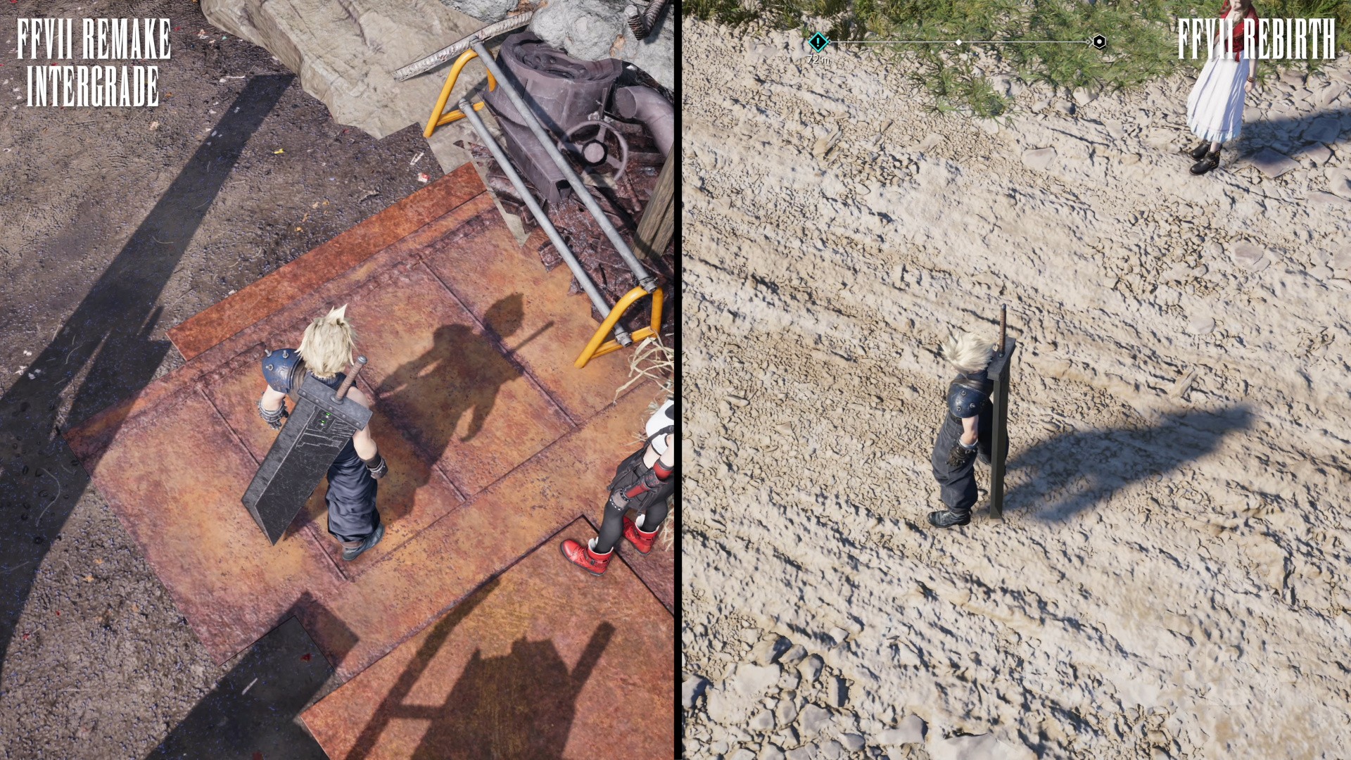 Relative to Remake, there's a big boost in the basic fidelity of these more naturalistic environments. Plus - and perhaps more importantly - Remake doesn't actually have any truly open areas, with the map featuring a more tightly constrained scope. These wide-open gameplay spaces are new for Rebirth. On top of that, distant detail is made of real geometry, unlike Remake, which often resorted to 2D art.