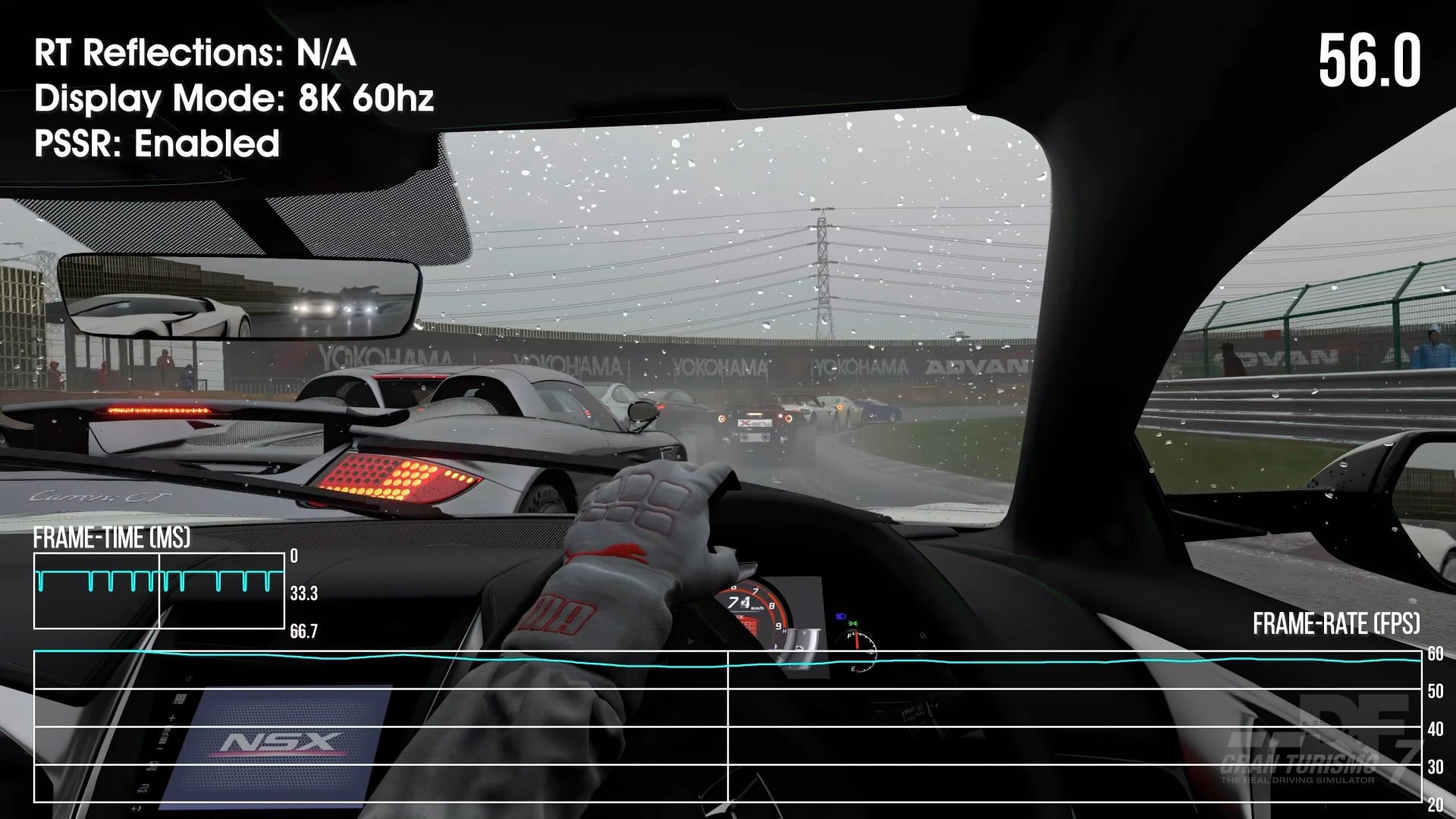 When playing with RT enabled or at 8K, the game outputs at 60Hz with a 60fps maximum frame-rate. It's almost always a locked 60fps, even in the 8K mode, but it's possible to see drops in very select scenarios - eg watching a replay of a full standing start in the wet. At worst, 8K mode can drop into the 50s during gameplay, but you're still within range of VRR to make these drops less noticeable. Given that the internal resolution is 4K, that's pretty impressive. The cinematic angles offered in replays tend to run worse than the usual chase, bumper or cockpit cameras, with PSSR tending to offer better performance here.