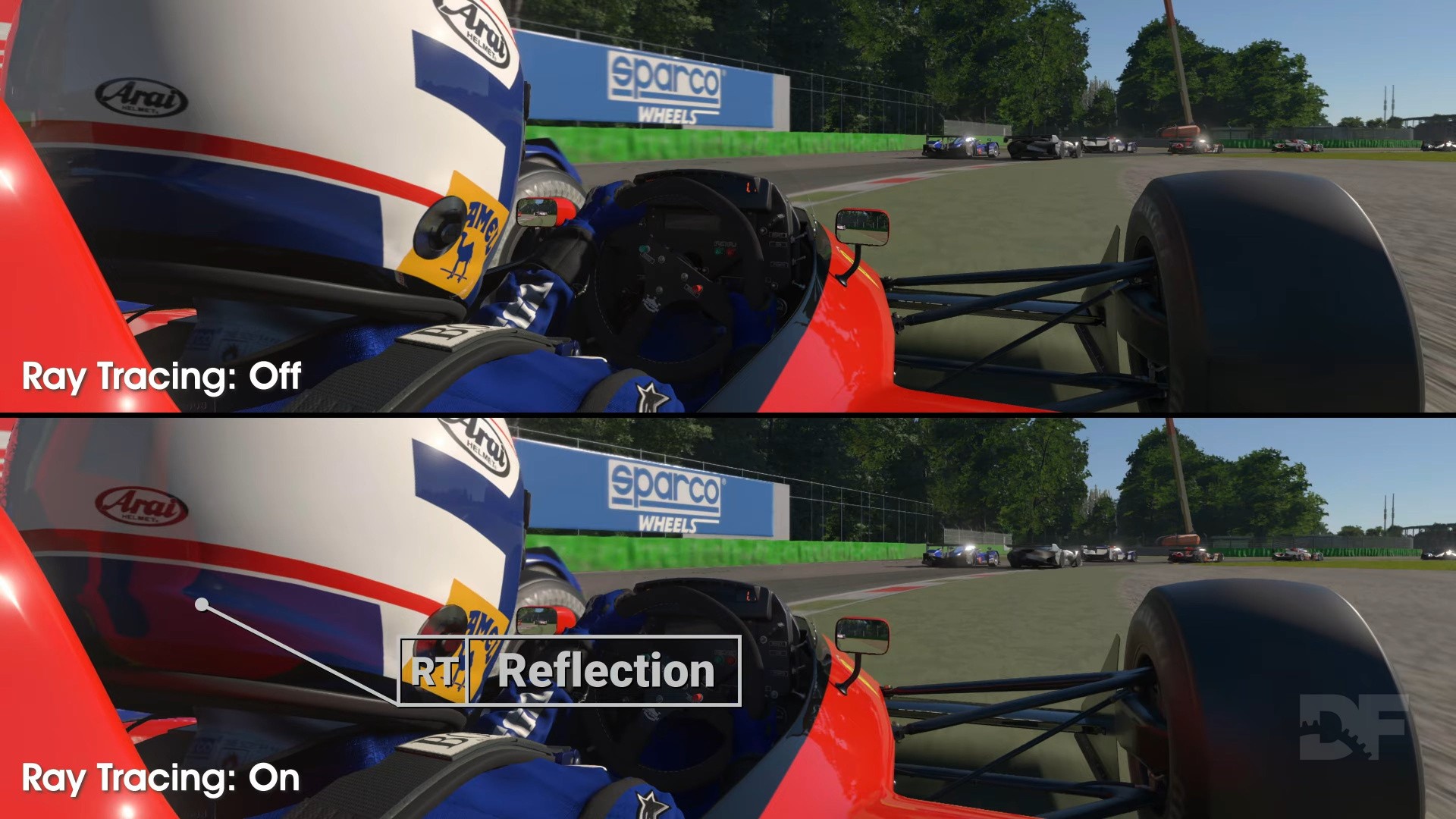 The graphics priority setting is also different, with the "prefer RT/resolution" mode now providing RT during gameplay rather than just in replays and photo mode. That means that car surfaces show self reflections, world reflections, lights and other cars, replacing the earlier (still excellent but limited) cubemaps. Reflections now more accurately correspond to the world around you and update more frequently. There are still a few limitations - trees, for example, look simplified in the game's BVH structure - but the aggressive roughness cut-off means that even matte surfaces can produce realistic reflections, which makes interiors look incredible.