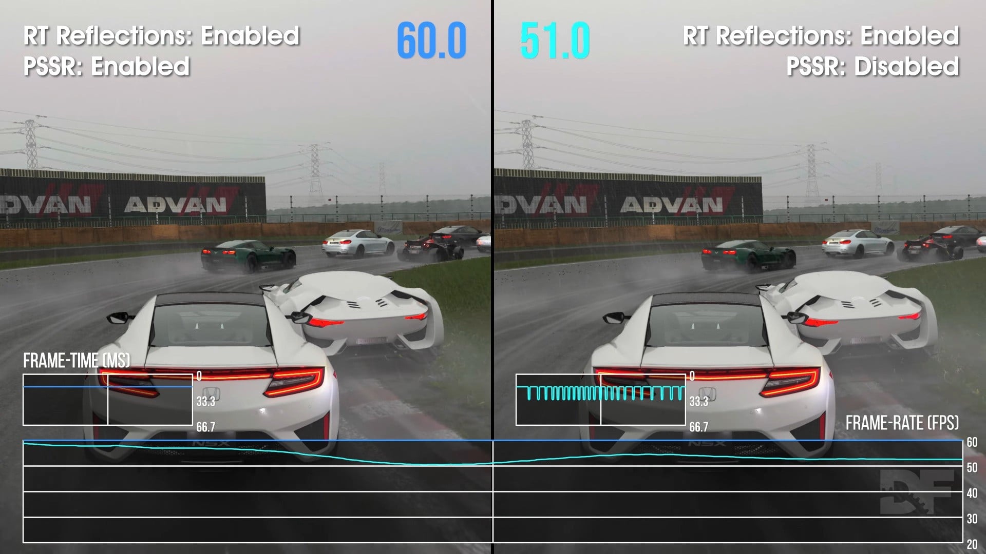 Given this information, you'd expect that the PSSR view would be inferior to the native 4K presentation - and that's indeed the case. However, the gap between the two is smaller than I expected, with just a few noticeable issues differentiating the two possibilities. First, thin objects can exhibit additional shimmering and noise, such as trackside crash fences, and second, artefacts can appear in certain scenarios. For example, I noticed noisy, flickering taillights with PSSR and RT enabled on a Toyota Supra.