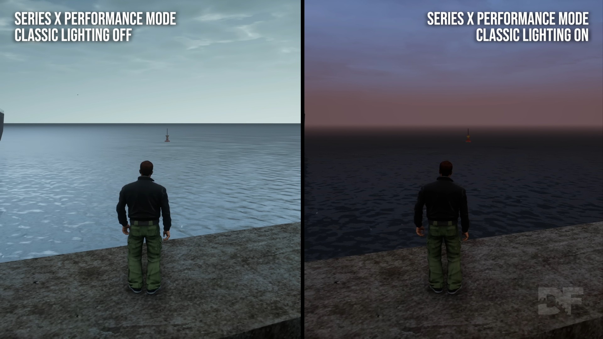 In GTA 3, the classic lighting often gives the game a darker look and sometimes imparts a bit of a blue or green tint. The opening cutscene is certainly much closer to the grading of that original sequence now, though other scenes often show a less profound difference. In general, the classic lighting fits better with the original lighting presentation. If you look at the horizon, you can see another key change with the classic lighting, as the horizon is harder to distinguish as a fixed line. Instead, the haze softens the contrast between sky and water. This is arguably more realistic, though somewhat exaggerated. Haze is often more prominent close to the player in other areas too.
