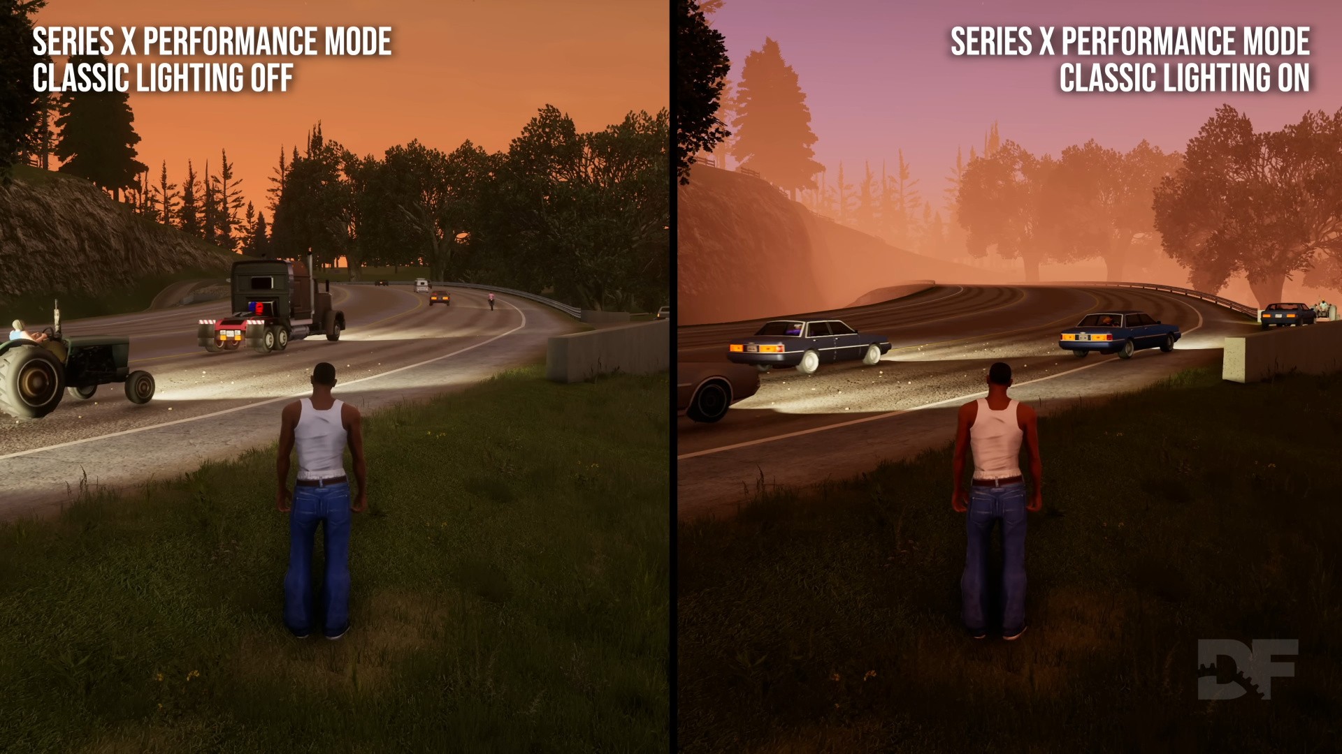 Let's start with the good stuff: the classic lighting option is a big improvement, capturing the spirit of the original games - especially in San Andreas. This is apparent from the opening cutscene, with similar lens flare effects, the same smoggy sky gradient and thick smog close to the camera. Late in the day, San Andreas is bathed in a kind of orange haze, as sunlight passes through a larger portion of the atmosphere. The same holds true in gameplay, with a substantially closer match to the game's original look in most conditions and areas. The regular lighting mode feels somewhat sterile in comparison. The classic lighting option also introduces other atmospheric effects, like fog particles, in certain weather conditions.