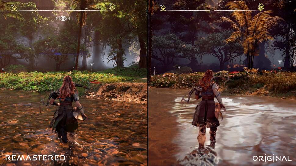 That said, effects work has improved in lock step with the assets, with water rendering a great example. This is something I had taken issue with way back in my original analysis on Zero Dawn. The water simply doesn't look very good at all. It uses an ugly, low resolution approximate cube-map along with poor SSR. Forbidden West absolutely blew the doors off Zero Dawn with amazing water rendering throughout. Zero Dawn Remastered, in comparison, sits somewhere in the middle. It never quite appears as striking as the sequel, but the improved SSR and fallback reflection system do make a huge difference. Reflections can appear slightly pixelated on close examination but it's miles beyond the original and really shows off the surroundings. Furthermore, the improved caustics and handling of light above and below the surface produce a far more pleasing image. Scenes like this really showcase how much better the water rendering can be.