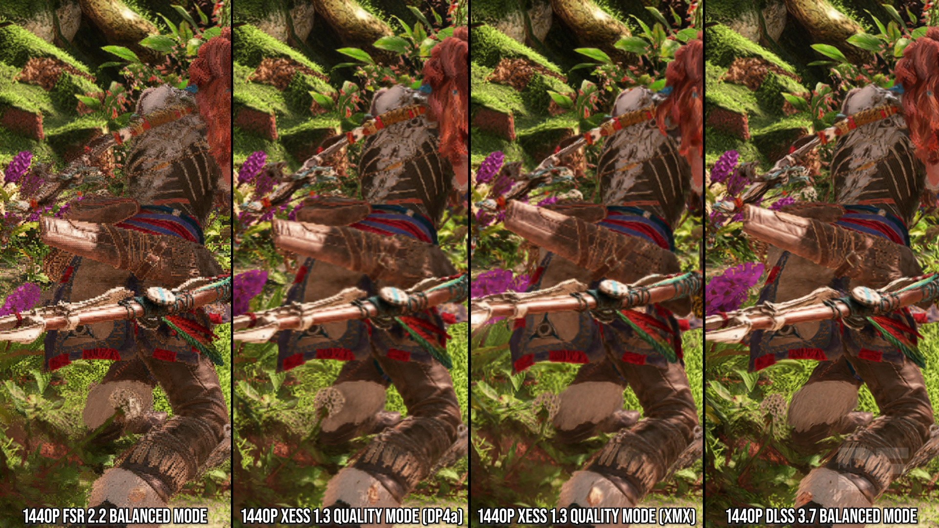 Next up, how do the new upscalers compare with FSR 2? AMD's tech is ripe for improvement, lacking good anti-aliasing on moving objects. There's also a generic fizzle, while transparent elements like foliage have an ugly, crunchy look. XeSS's DP4a path is clearer and cleaner, but there can be slight bluriness and smearing. Looking at DLSS, the reconstruction of the moving objects is much cleaner with lines being completed and detail resolving more pleasingly, and there is no blurriness or smearing occurring.