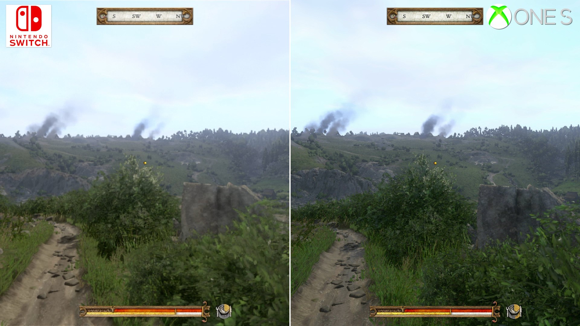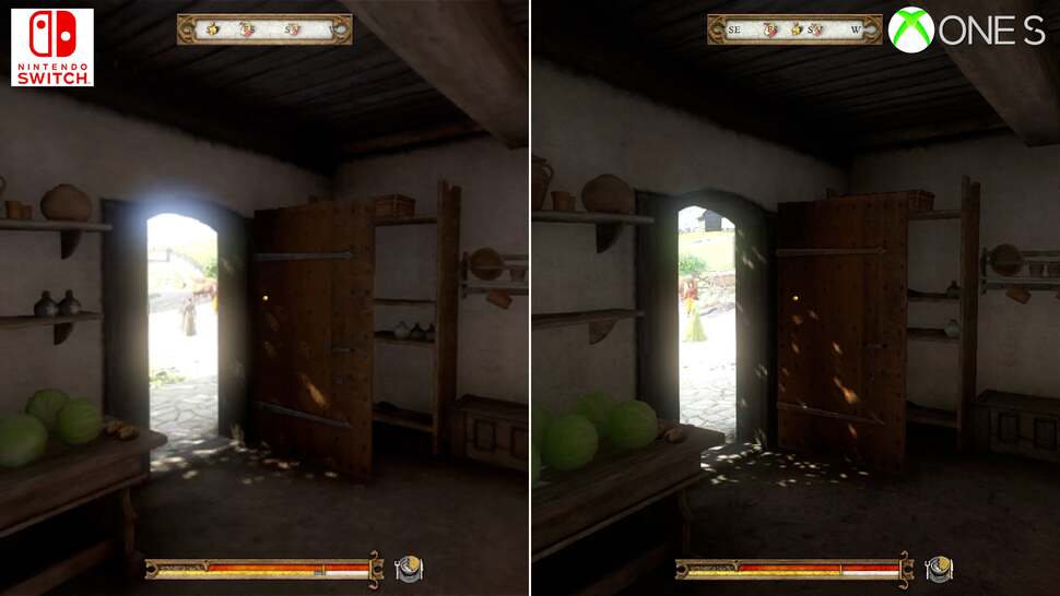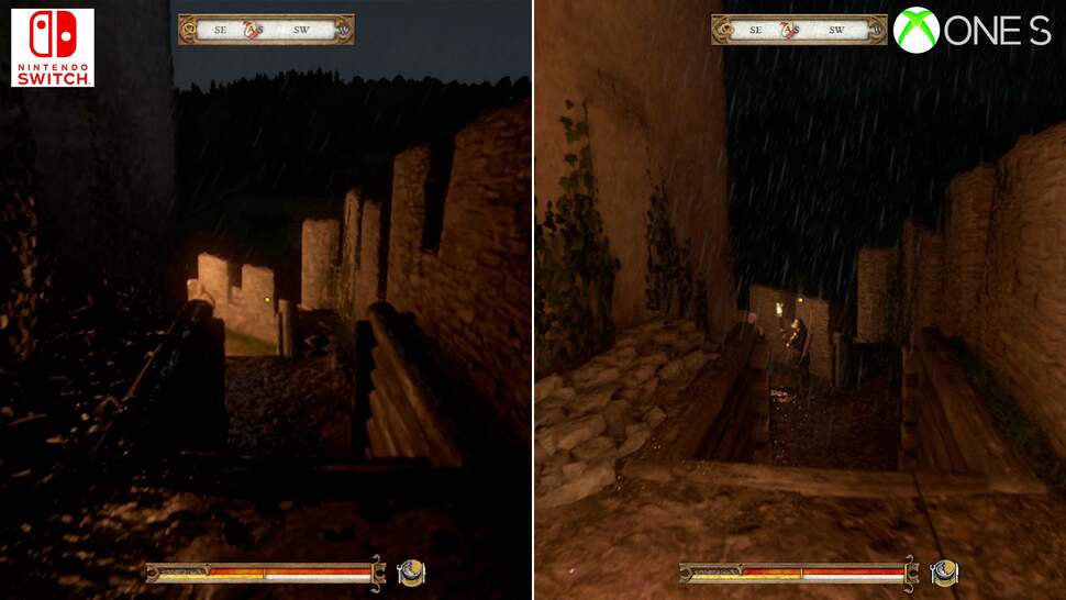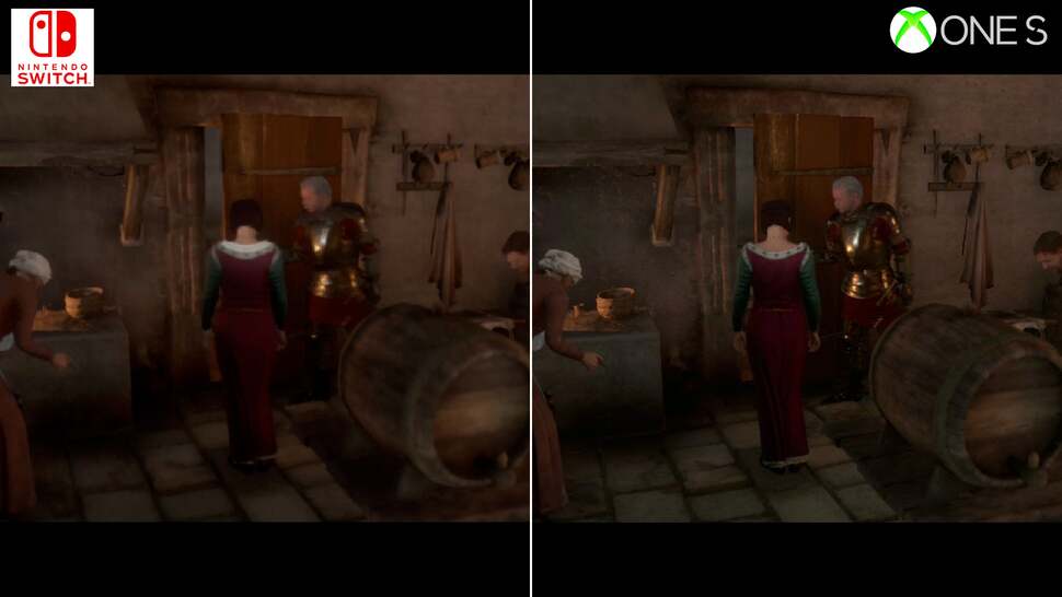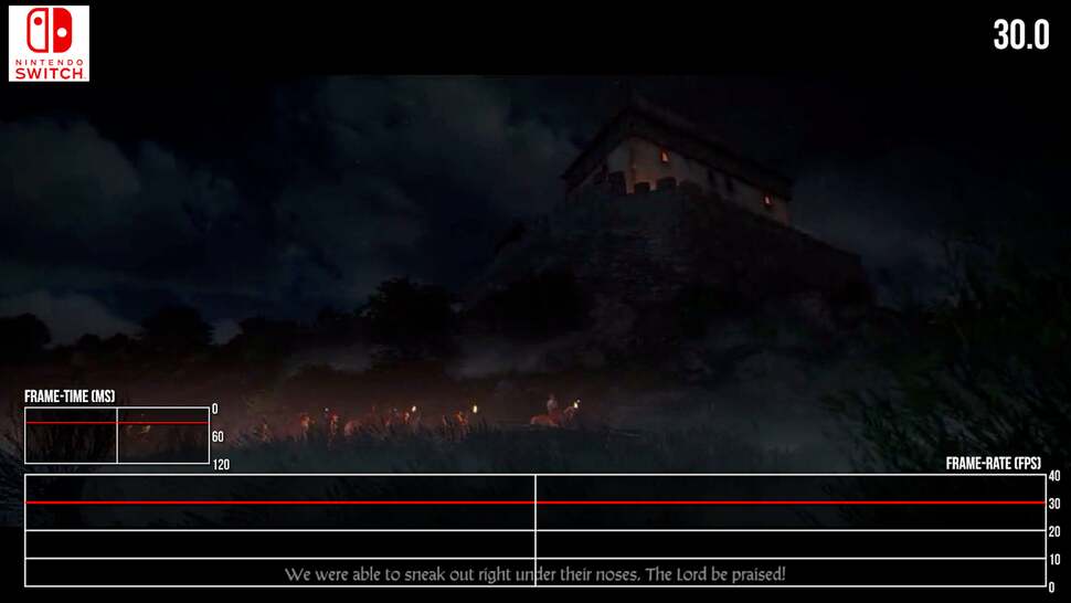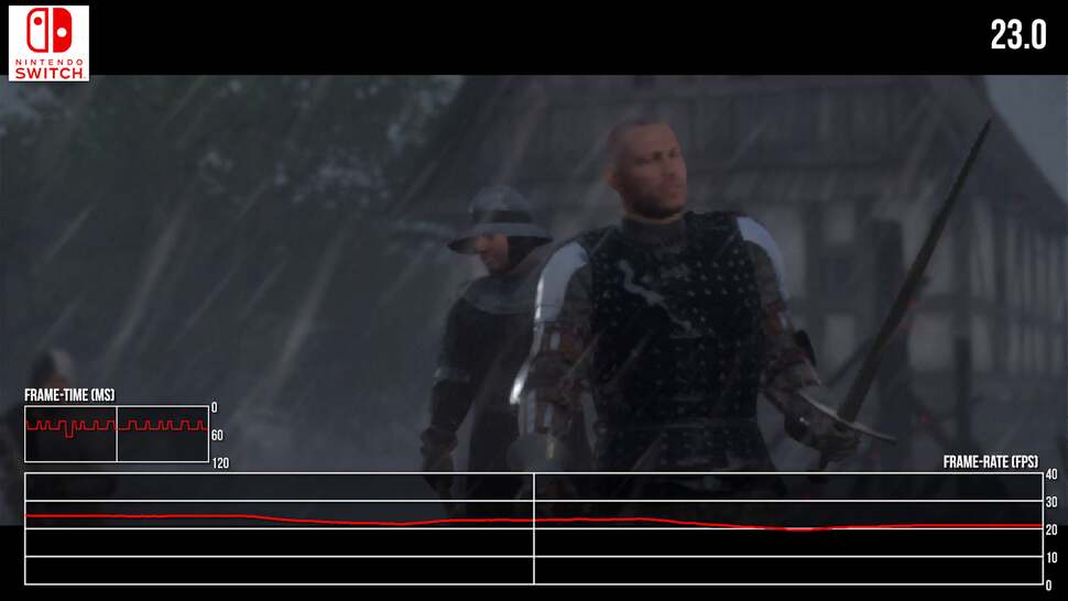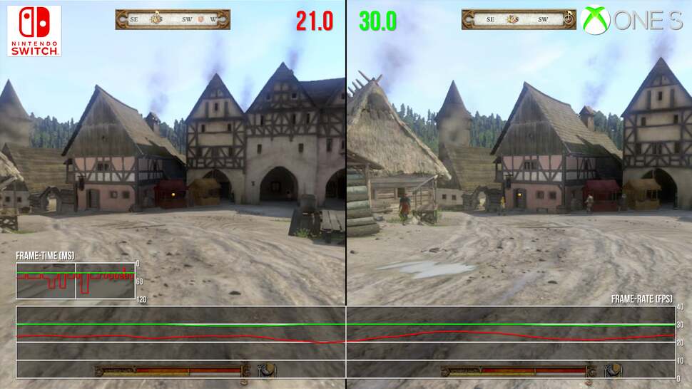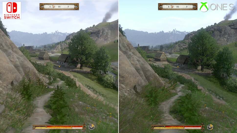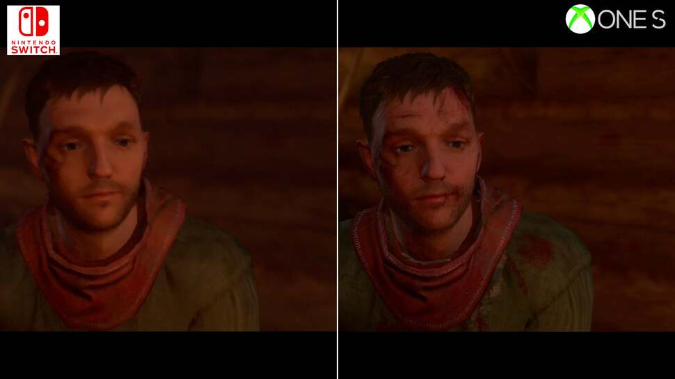 To put this into perspective, neither PS4 or Xbox One were immune to these drops. Each had their fair share of hitches and GPU-side stress points, but they're exacerbated in the move to Switch's more CPU and memory-limited hardware. In direct comparison there's a mixture of fortunes here: complex scenes around towns run much better on an Xbox One. No question, the last-gen Xbox hits the mark at 30fps more consistently, and likewise around taxing points beyond the city walls. Switch delves into the mid-20s around these moments. Interestingly though, the cutscenes are, against all odds, often comparable in frames delivered per second between the two. Certain close-ups of leading man Henry run better on Switch, while other points show an Xbox One lead. Put this down to the pruning back in resolution, and visual settings - but Switch can be more performant. However, typical gameplay is still often under the 30fps line on Switch - despite the many visual cutbacks put in place.
