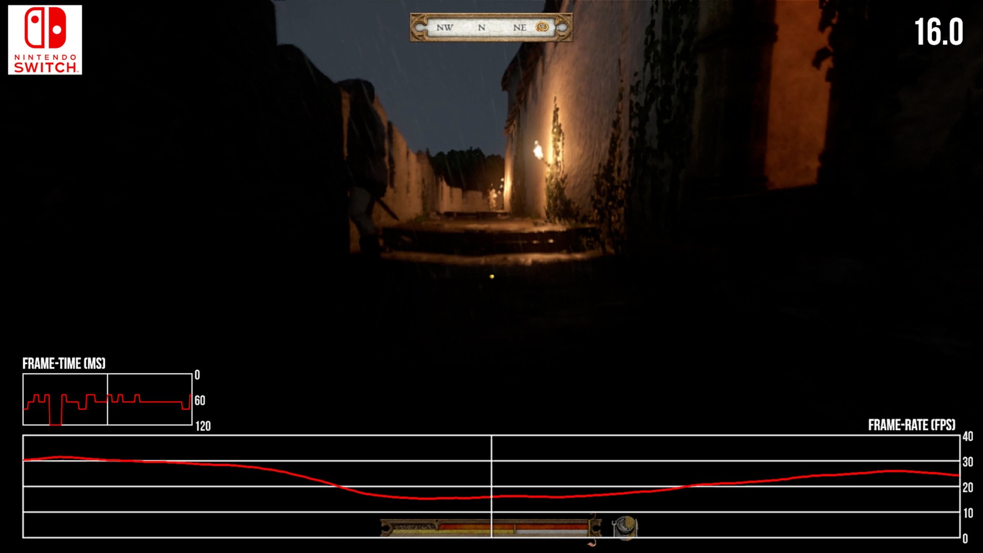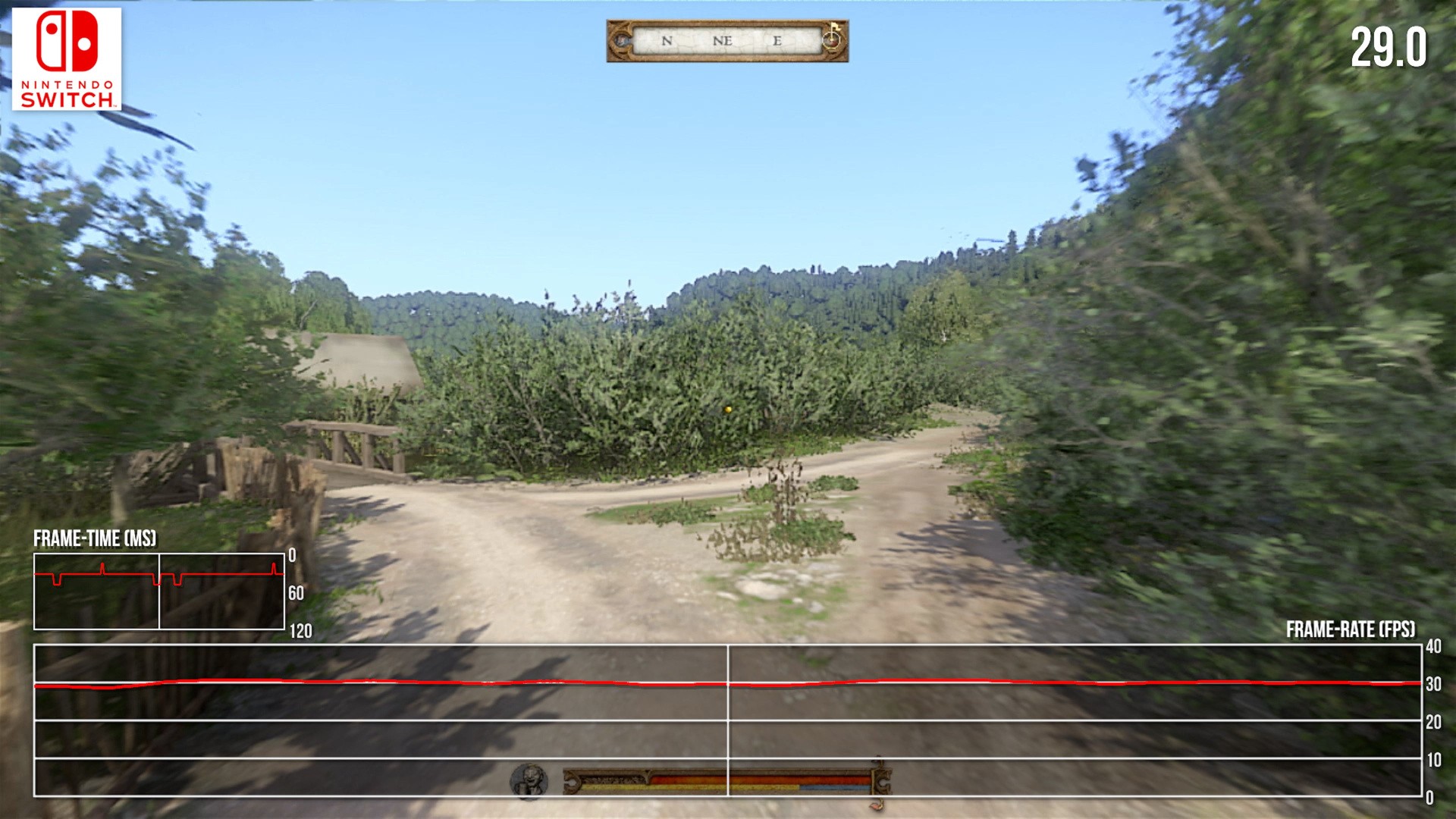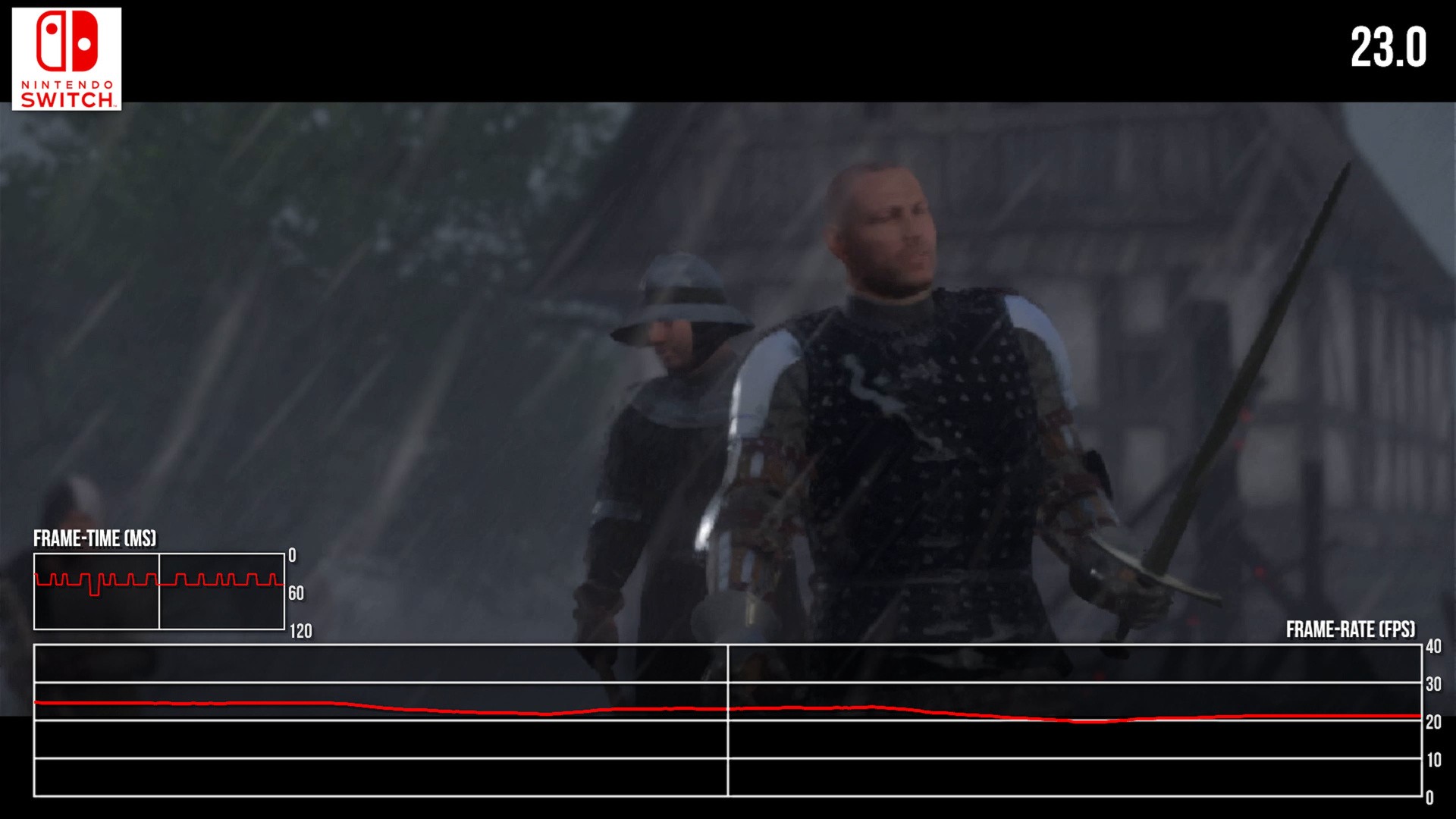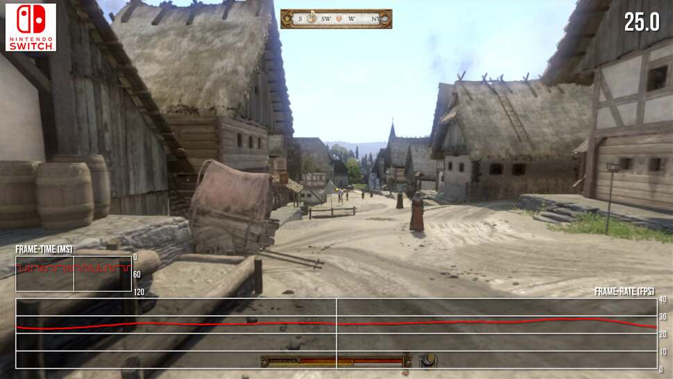 It's not aggressive. It's not Bloodborne levels of uneven frame-pacing, thank goodness, but it does detract from the perceptual smoothness of movement. If all we want to do is sight-see this is fine, but Kingdom Come: Deliverance is an RPG built around bustling town areas as well. We have battles, cut-scenes - and sadly, all of this plummets Switch's frame-rate into the 20s and lower.
