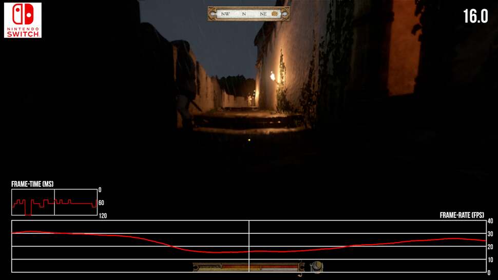 Performance is the main issue, as you might expect. The bottom line is that Switch struggles to cap at 30fps in every area, and that's evident from the very first village. On the upside first, we do get a fully v-synced, locked 30fps at points. Open outdoors areas with no NPCs nearby - with only yourself and the grassy fields in view - run at 30fps especially well. Credit where it's due, the fact Saber has optimised these broad open areas to hit 30fps is respectable. The snag is, unlike the Xbox One or PS4 versions today, frame-pacing issues are present regardless. Even in the best case at 30fps, there are occasional frame-time spikes to 16ms on Switch.