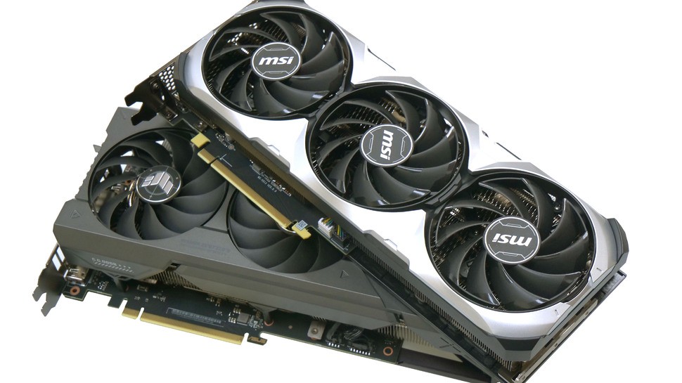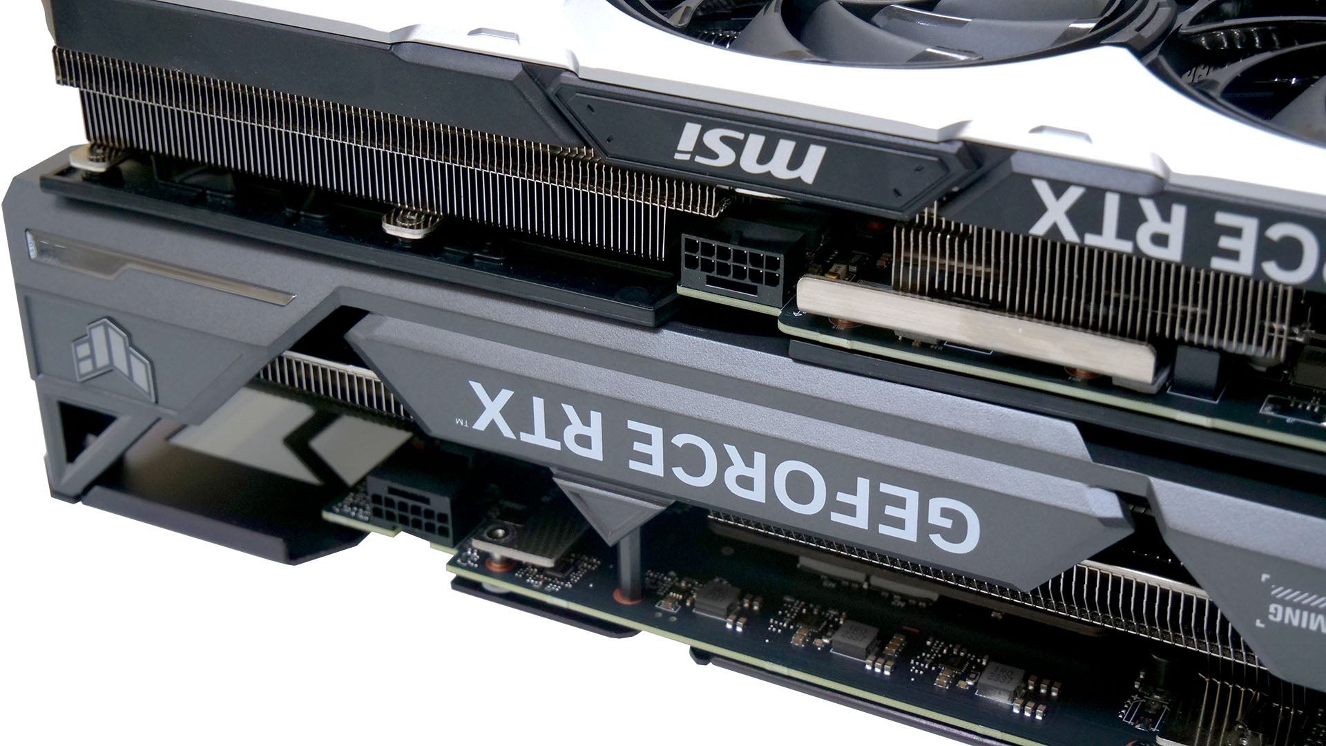 However, their sheer size and bulk - enough to register on DRADIS - do at least ensure very quiet operation and good temperature management. The 12VHPWR socket is back on both models for power delivery, while it's the usual assortment of HDMI 2.1 and DisplayPort 1.4a video outputs on the rearof the MSI model, while the Asus (helpfully!) gains an additional HDMI port.