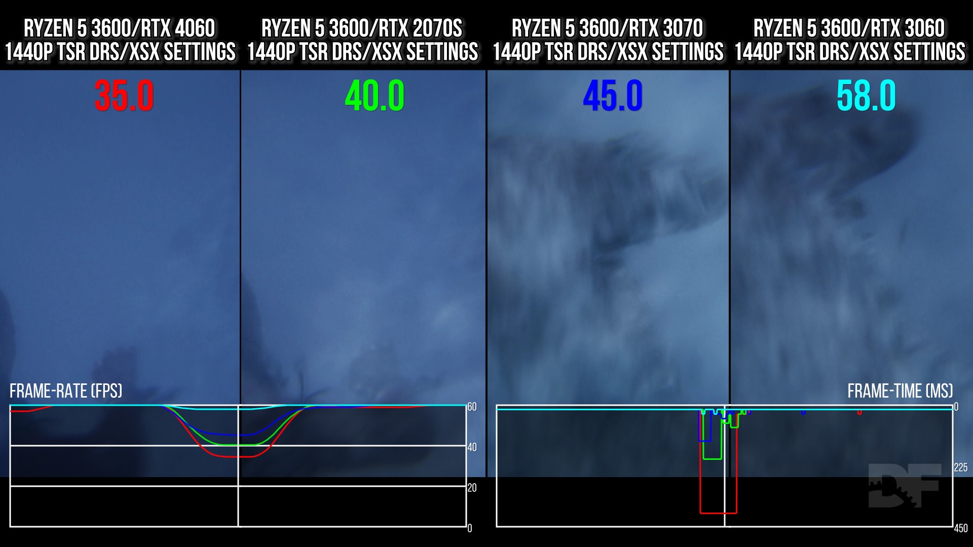 Another potential source of frustration for some users in Hellblade 2 concerns memory management. In short, users with graphics cards equipped with 8GB or less of VRAM will often see large frame-time spikes when certain events occur. For example, in the game's opening running on an RTX 4060 8GB graphics card at 1440p, a wave crashing down on Senua causes a huge frame-time spike - and we see similar issues throughout the game, including just before you take control of Senua after a cutscene. Tellingly, these spikes don't take place on the RTX 3060, which is slower overall but does come equipped with 12GB of VRAM. Other 8GB graphics cards exhibit similar issues, though cards with higher PCIe and memory bandwidth - like the RTX 2070 Super or RTX 3070 - suffer from proportionally smaller hitches.