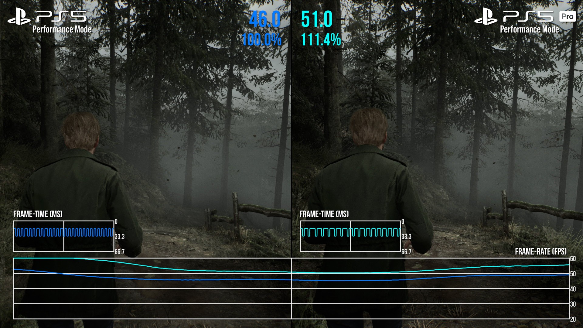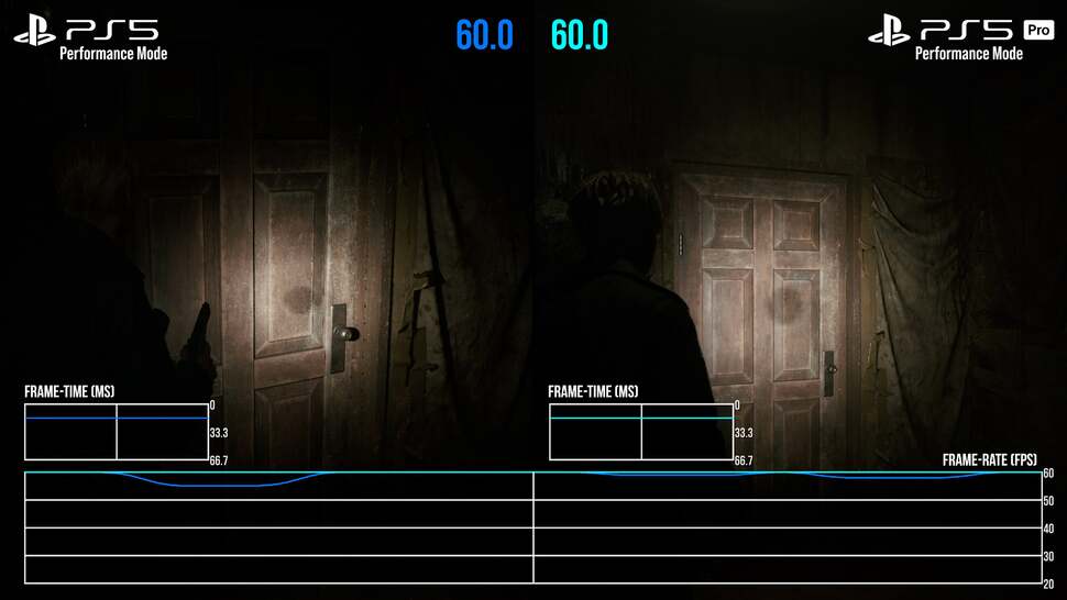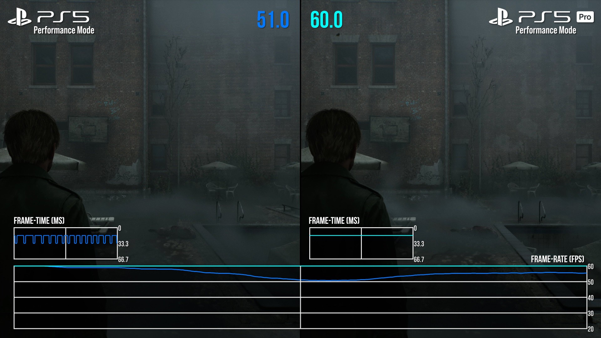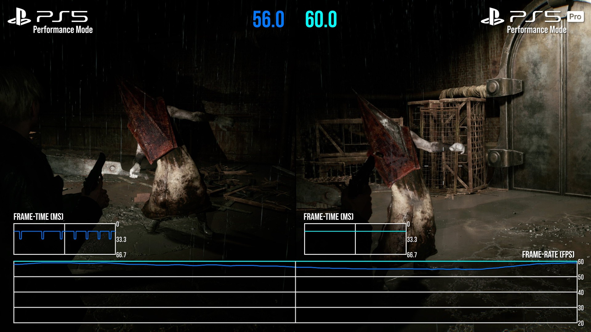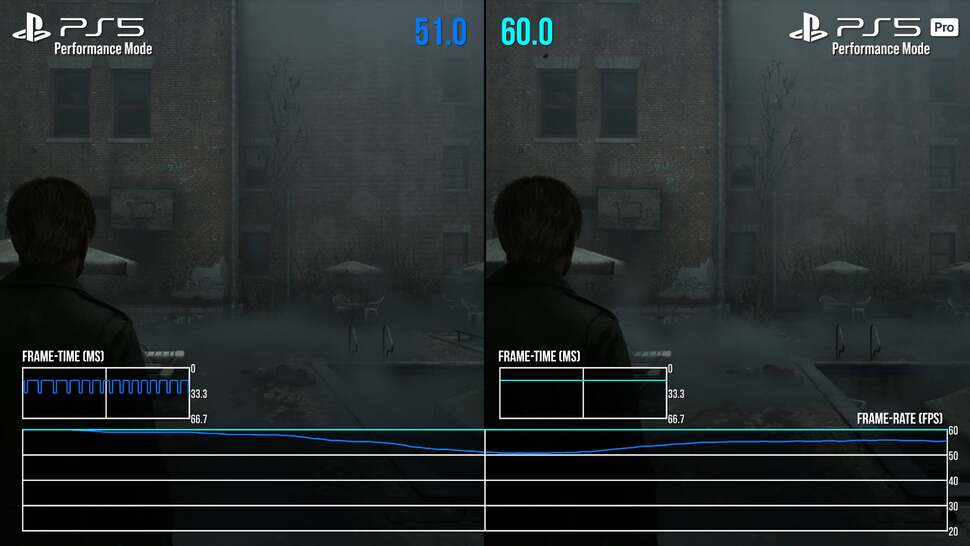 It's a mixed bag then, but there is some good news on the frame-rate side. Above all else, PS5 Pro offers a smoother 60fps experience, plus a much more stable 30fps mode than base PS5. In part, this is thanks to the fixed, static nature of the resolution now in place on each mode - at either 900p or 1080p, depending. Taking the 60fps mode in example first, we of course no longer have DRS trying to maximise the pixel count in every scene, which could lead to frame-rate drops on base PS5. Simply put, any time we turned to a more GPU-taxing part of the scene, there'd be a single, or small batch of dropped frames as the pixel count adjusted in that moment. Base PS5 always needed a second to adjust to the GPU load, if caught off guard by player movement. Not so on PS5 Pro: between Silent Hill's South Vale region, the apartments, and even battling Pyramid head, the fixed resolution target is more dependable. As a result, many of the sub-60fps drops and hiccups present on the performance mode are now cleaned up to create a tighter, if not 100 percent perfect 60fps line.