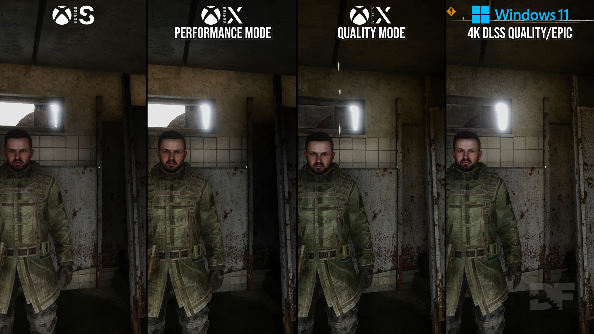 While I spent most of my time playing Stalker 2 on PC, the game plays well on Xbox Series X and Series S too. Series X gets a 30fps quality and 60fps performance mode, while Series S is a single mode 30fps experience. Pixel counting is a challenge, with dynamic resolution scaling and TSR upscaling obscuring the internal resolution, but Series S looks to range from 648p to 864p, reconstructed up to 1080p. Series X's performance mode is slightly higher res, from 864p lowest to 1152p highest, reconstructed up to a (soft-looking) 4K. The quality mode looks a lot better, with an internal resolution at or around 1440p.