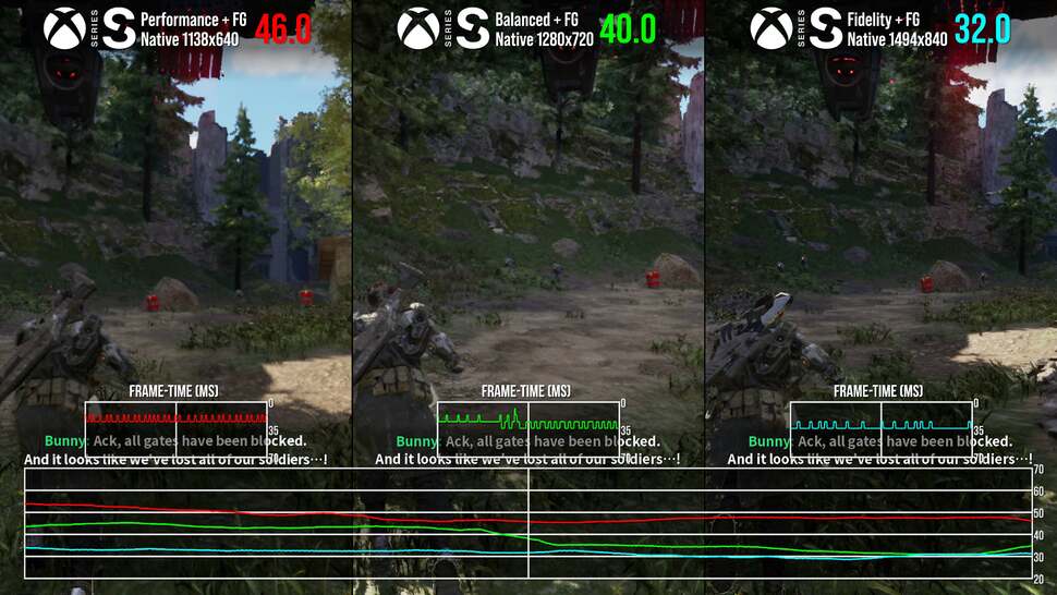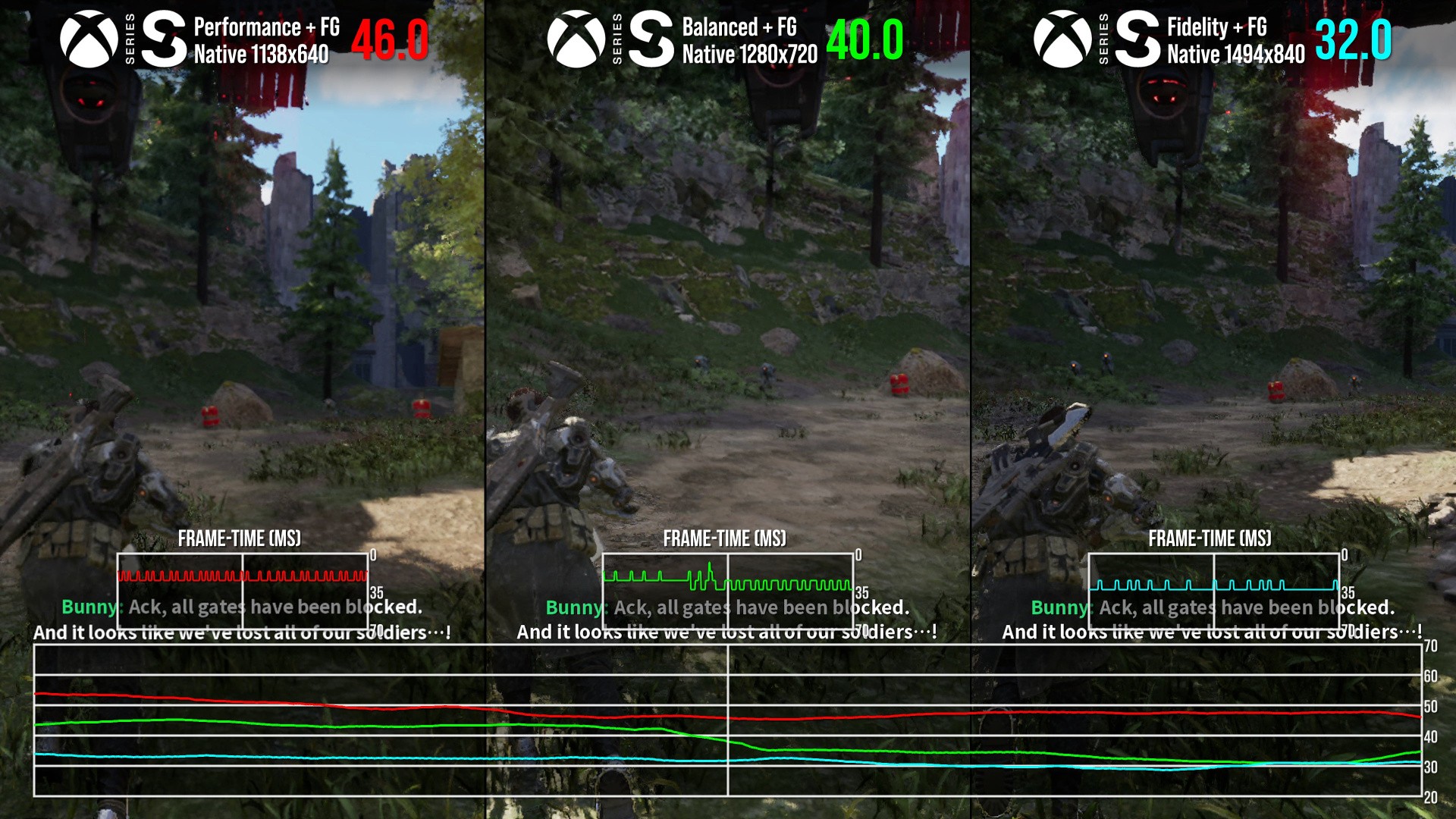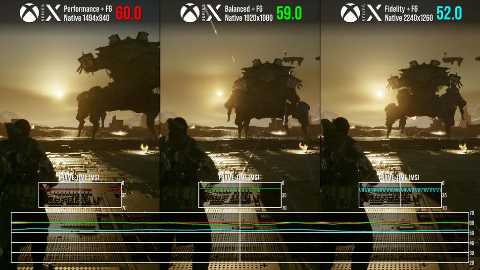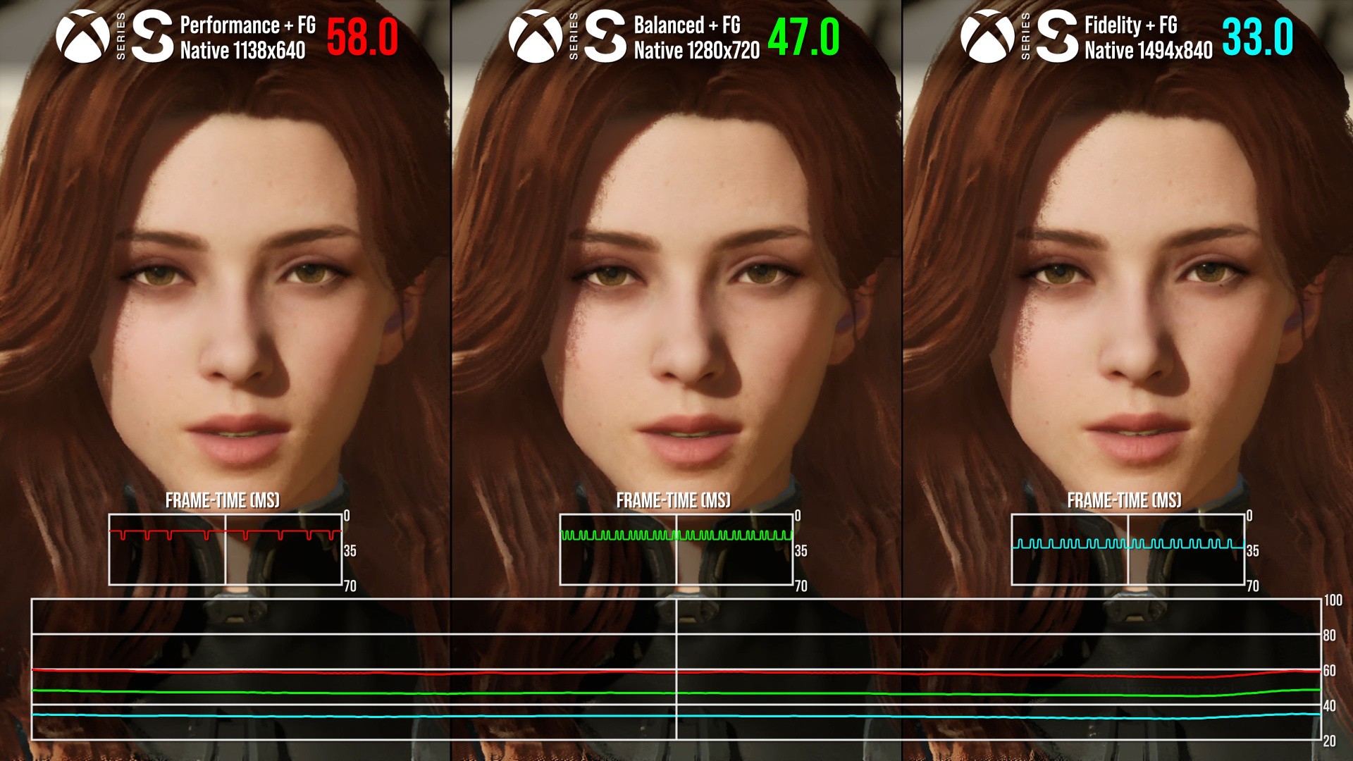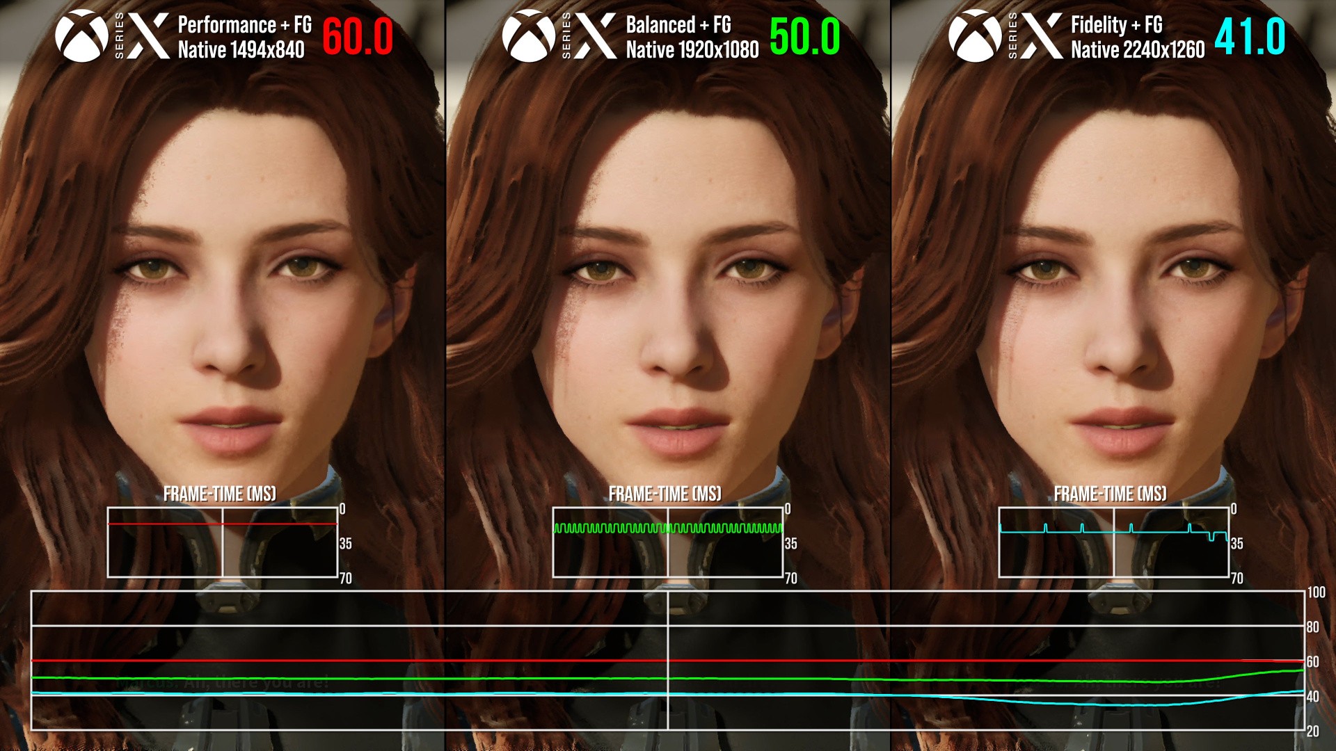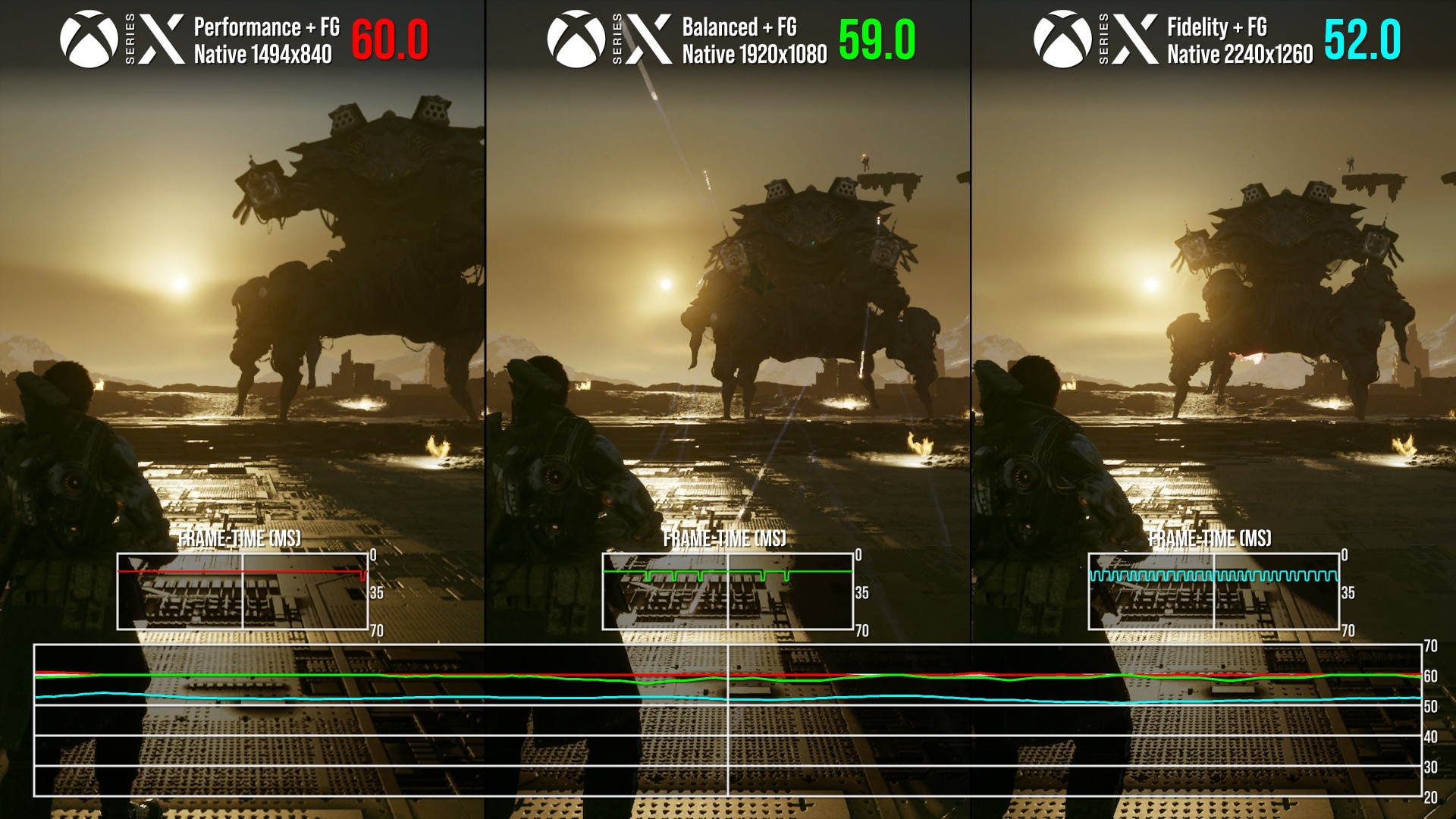 Focusing on Series X first, bizarrely, frame-rate readings show that its performance mode is the only one capable of getting to 60fps consistently. Even with frame gen in assistance, the fidelity mode too often falls below the 60fps target with frame gen, coming in as low as the mid-30s during cutscenes. It's impossible to recommend using fidelity mode this way, and it's a dead end in terms of any practical use-case.