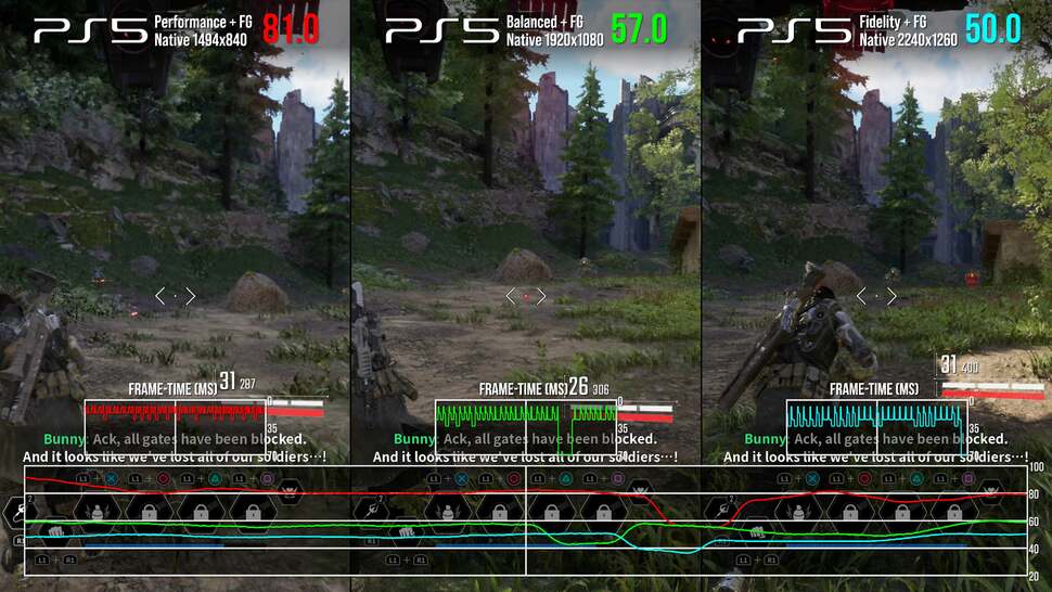 Next up, PS5 throws something of a curveball our way with its higher 90fps target allowed by FSR 3 frame gen. All resolution metrics are identical to Series X, but running at 90fps does mean that PS5 outputs 50 per cent more frames per second than the Xbox console in the best case. It’s an odd fit too, slotting 90fps within a 120Hz output feed, and equally, it’s clearly a stretch for the fidelity mode to generate triple the number of frames from a baseline 30fps. On the plus side, mixing the performance mode with frame gen gets us to the 90fps line more often than you’d expect. It’s between 70-90fps most of the time in gameplay, albeit with highly erratic readings on the frame-time graph. As for the balanced and fidelity modes this is clearly too much of a stretch: 30-60fps is the range there, and again, in every mode we found VRR didn’t engage as it should to resolve the erratic frame times. Even at 90fps, frame gen is still not as useful as it should be on Sony’s hardware, and often, disabling frame gen for a more consistent 60fps is a better way to go.