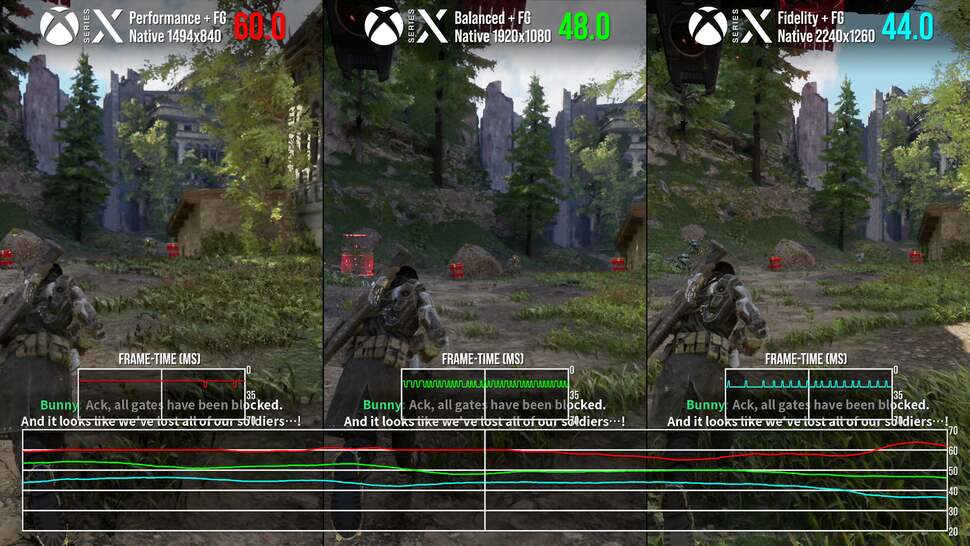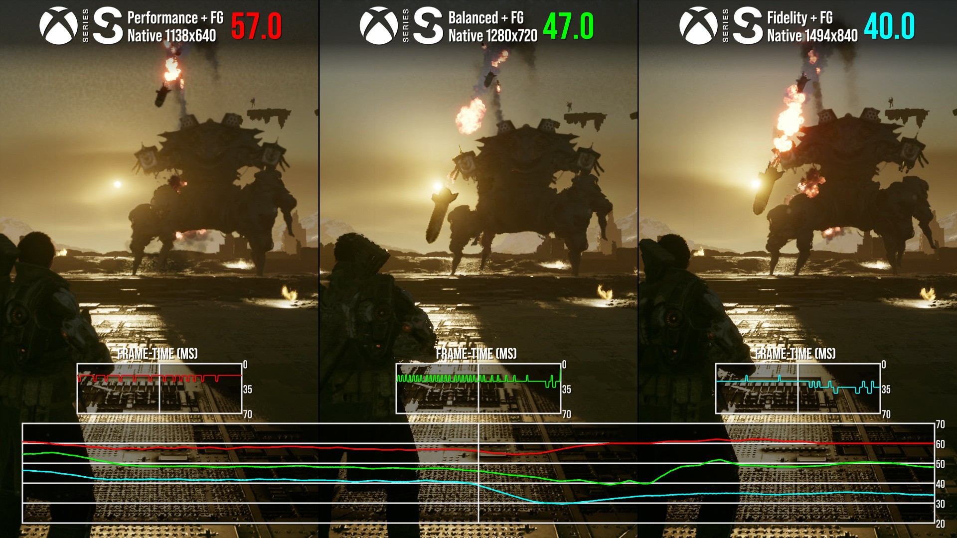 Balanced mode, equally, does not fare much better on Series X when compared to the broken capped 40fps experience with no frame gen enabled. Adding frame gen does at least allow for a rise to 60fps in segments, matching the performance mode's 60fps line in simpler areas, but cutscenes and explosion-heavy gameplay still drop to the mid-40s or even the high thirties, which doesn't happen with frame-gen disabled.