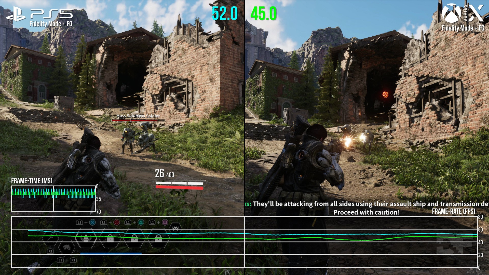 Comparing PS5 versus Series X directly, it's clear that the PS5 leads in every test too - regardless of the higher frame-rate cap with frame gen involved. Matching gameplay is tricky in this title, but the PS5 reading is typically 10fps or more ahead of Series X in fidelity mode stress tests. I'd be hard pressed to recommend using frame gen with any mode on either console honestly, but for whatever reason the PS5 version is at least able to generate more frames in the end.