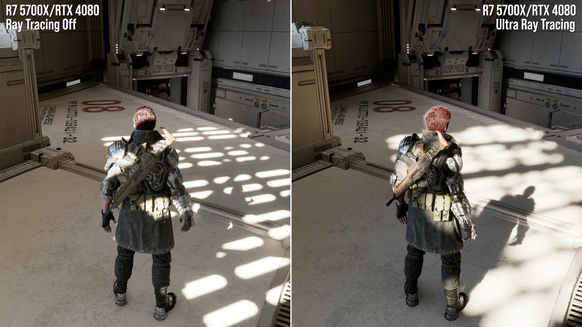 With regards to ray tracing, let's nip the issue in the bud right away. On PC, there's a generous suite of options to tinker with, with the full complement of Nvidia DLSS 3.5 and AMD FSR 3 features plus multiple tiers of ray tracing quality. At best, you can engage RT reflections, RT shadows and RT ambient occlusion via a single drop-down menu - via the ultra setting - but this heightened fidelity comes at an expected cost to performance. In the end, even high-end hardware like the RTX 4080 in our test rig required frame generation for a fluid frame-rate. Also, while the benefits of the ray traced shadows and AO stand out most - with shadow outlines across the main hub area switching to a more realistic, diffused look - it is not essential to this particular playing experience, and the game presents well with the typical rasterised approach.