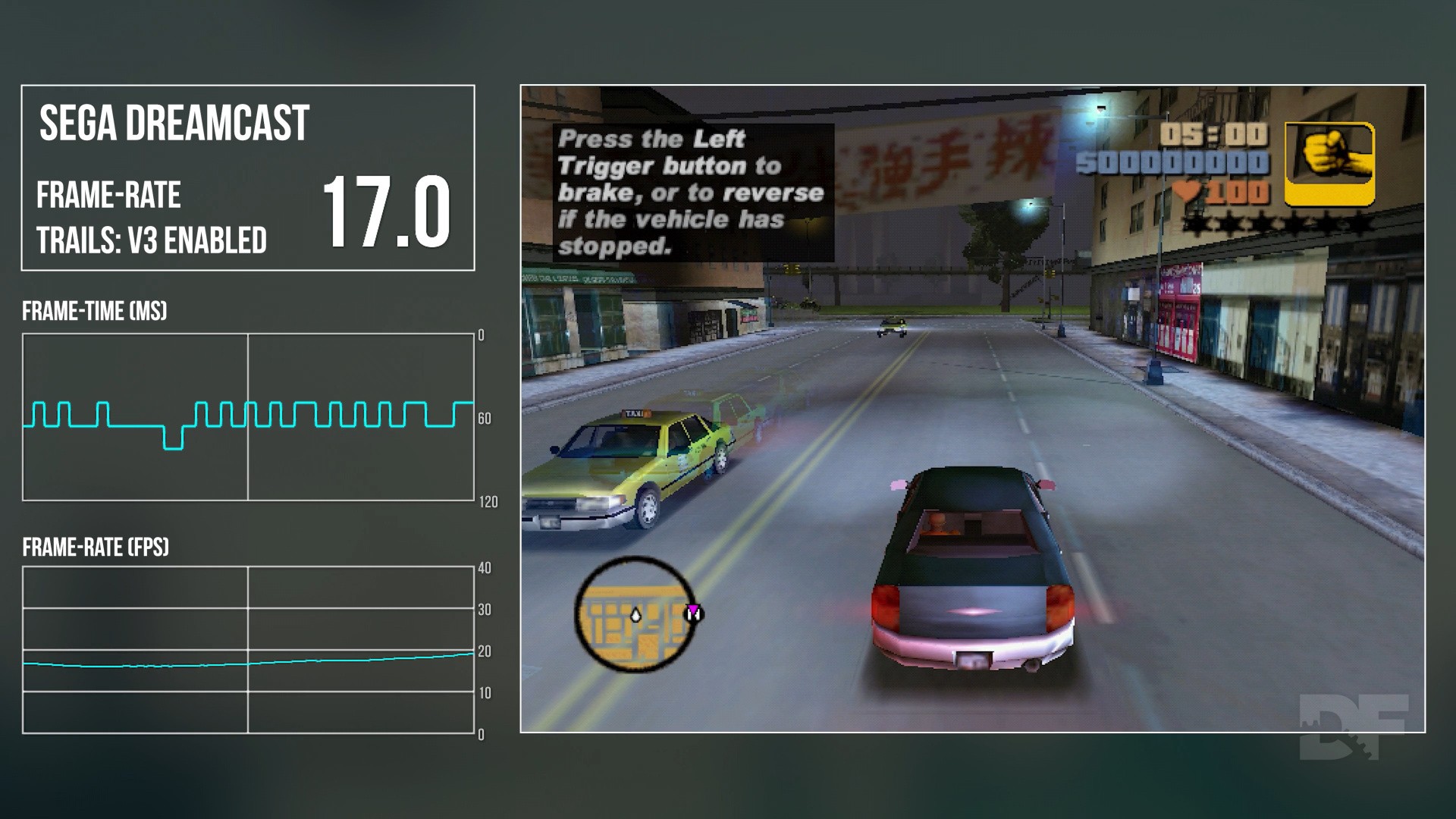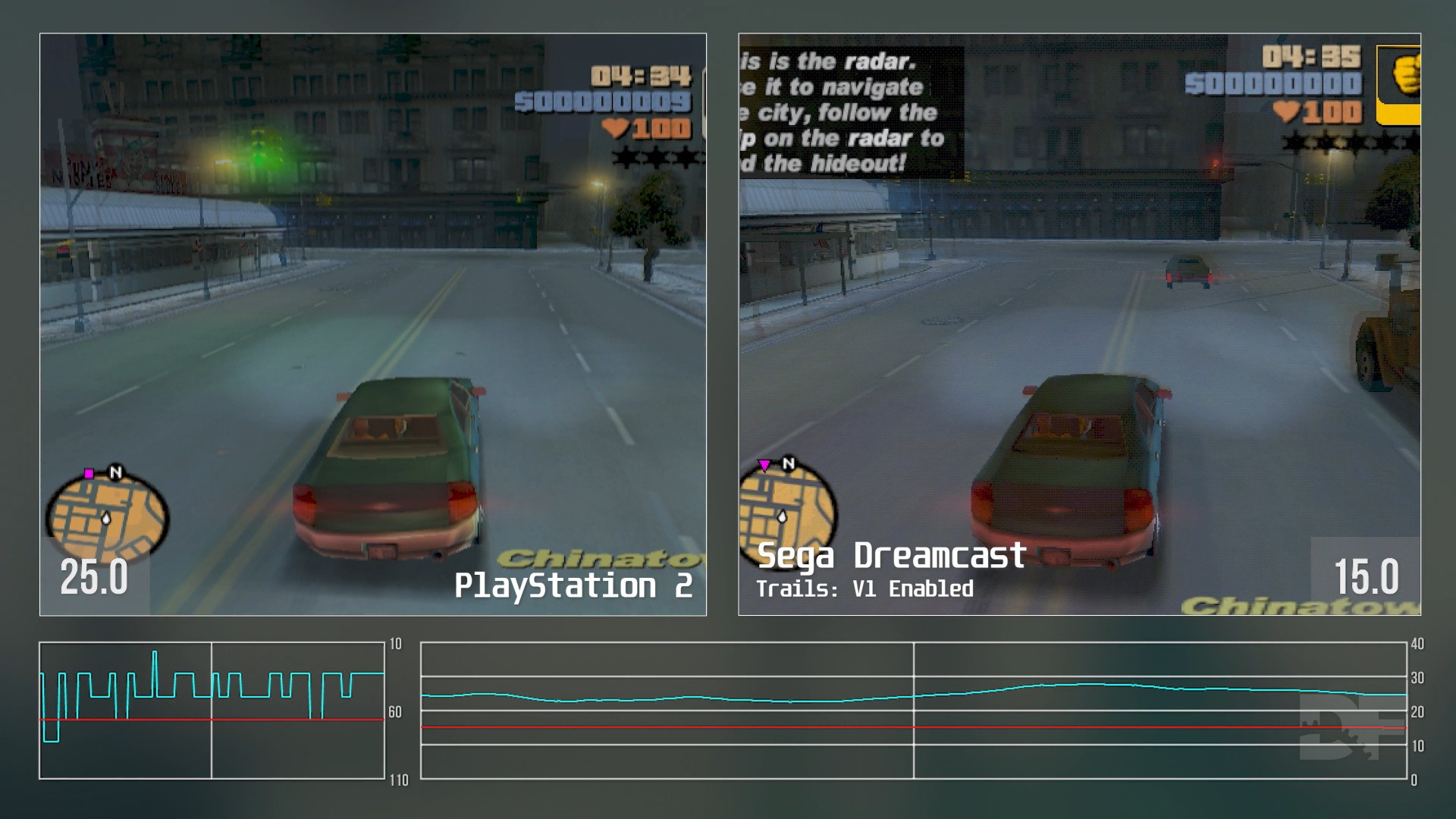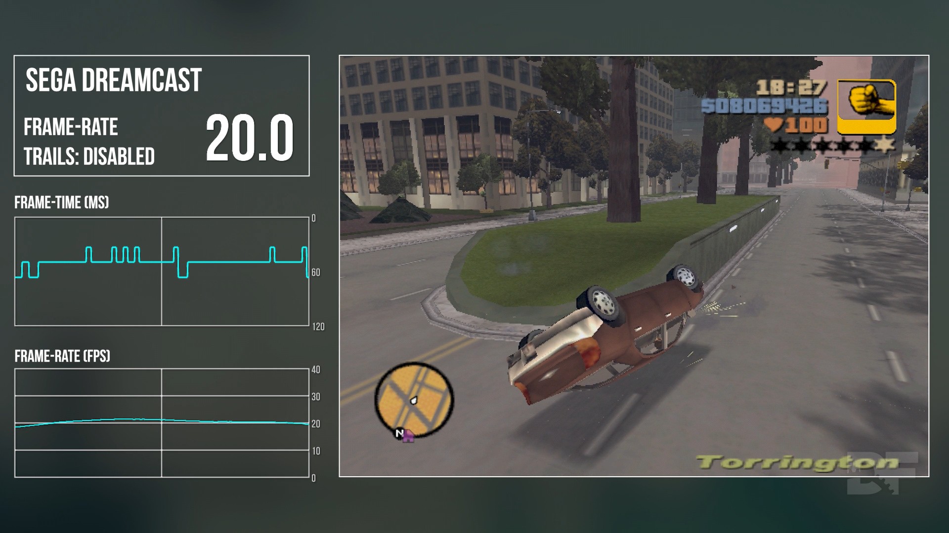 In terms of performance, let's discuss the permutations of my testing. I used the V1 trail effect on Dreamcast, which is the closest match with PS2. With this feature enabled, however, the frame-rate is limited to just 15 frames per second on Dreamcast as going above this isn't currently feasible, though I'm told there are plans to further optimise. It's unlikely that we'll see more than 20 fps with trails, though. I was simply curious to see how it compared to what is the default state of the game on PS2. This testing also revealed to me why GTA 3 always felt so choppy on PS2 - frame-pacing is poor, with lots of random 16ms spikes. I always noticed this back in the day - GTA3 is not smooth compared to its contemporaries. This was forgiven, though, due to its revolutionary design but still, now we know why it feels this way.