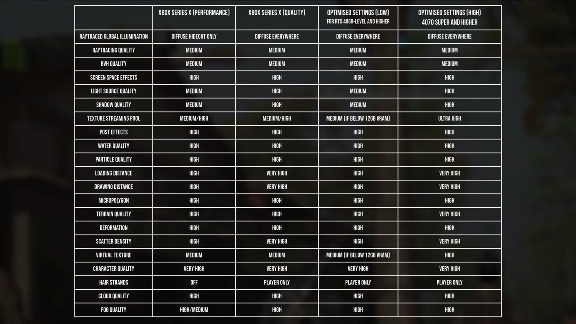 Let's talk about optimised settings, where I had two specific priorities: firstly, unlike the Series X and PS5 performance modes, I did not want to lose RTGI. And secondly, I did not want to lose the strand-based hair system, which is a real technical highlight. If you watch the video on this page, you'll see how we tackle changes to all of the key settings to achieve our best balance of quality and performance, with specific set-ups targeting lower range GPUs and then everything else. Allowances also need to be made based on how much VRAM your GPU has: the virtual texturing quality setting is best set to medium on 8GB graphics cards, but can go higher with GPUs that have 12GB or higher.