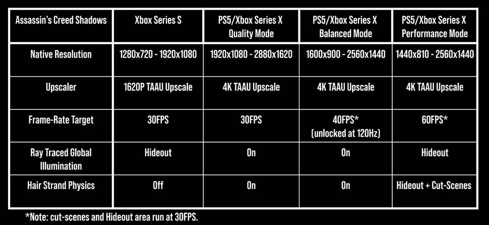 PS5 and Series X run with RT global illumination (RTGI) in their 30fps and 40fps modes across the entirety of the world, adding richer and more realistic ambient light bounce and shading. RT reflections are also included in Shadows, though it's restricted to the more powerful PS5 Pro and PC versions of the game - and this means the base consoles make do with screen-space reflections (SSR). Meanwhile, the 60fps performance modes on PS5 and Series X trade out ray tracing for a less accurate baked GI method, as we saw in ACs Valhalla and Mirage, though the hideout area forces a 30fps presentation with RTGI enabled regardless of mode. Likewise, Series S only receives RTGI in the hideout, with baked GI used elsewhere across the world.