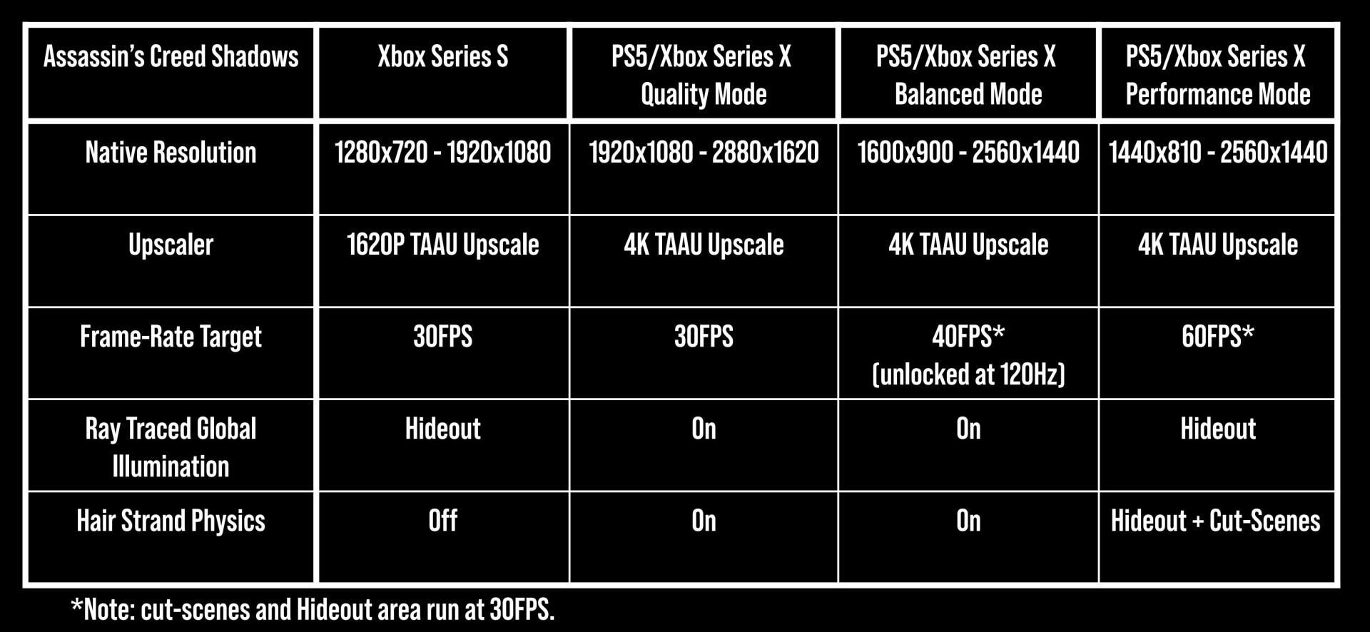 In a three-way comparison between the 60fps performance, 40fps balanced and 30fps quality modes, it's clear that RTGI and hair physics are the main factors to consider, but there are resolution differences too (as shown in the table below). Each mode upscales to a 4K output via TAAU on PS5 and Series X, while Series S scales to 1620p.
