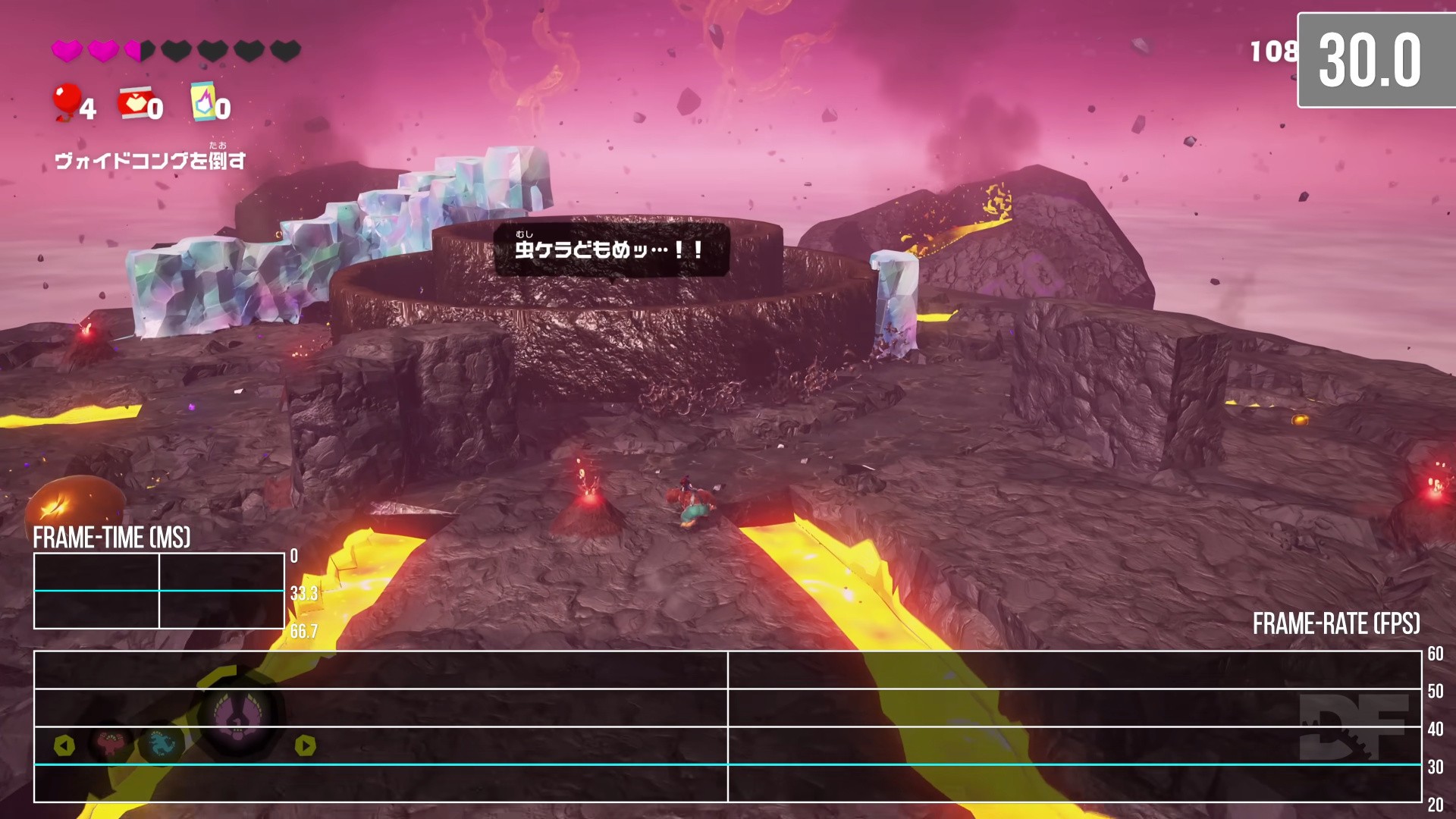 Handheld mode is more interesting. We know that the Switch 2 screen supports VRR, but support for it has been rare outside of the Welcome Tour demos. In fact, no shipping games seem to support VRR under 40fps, so low frame-rate compensation (LFC) isn't working. That's still the case with Donkey Kong, where using photo mode reveals the frame-rate can crash down to 30fps. We can't yet accurately measure this with our tools, but it's concerning that a first-party title is having the same VRR issues as Hitman. Regardless, from an image quality and performance perspective, Donkey Kong Bananza runs well enough in docked mode and a bit better in portable mode, though it could be improved in both departments.