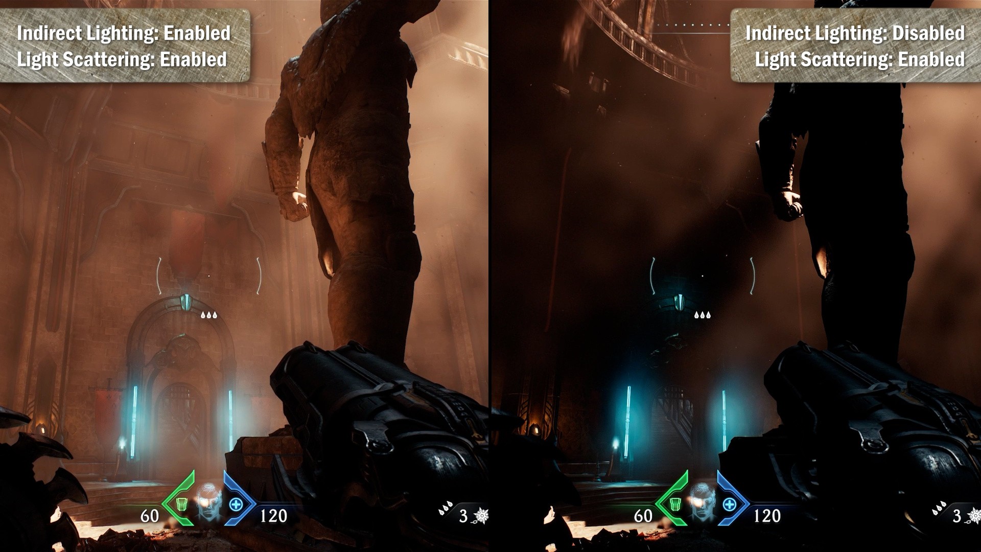 Doom: The Dark Ages uses an irradiance cache in probe volumes. Before ray traced lighting like this, developers would often pre-calculate these results through pre-computing or 'baking'. This technique meant that world lighting was more static and the actual iteration and build times were much slower. This is one of the most important shifts for the team. Speaking with Billy Khan, Director of Engine Technology at id Software, he noted that ray tracing essentially allowed them to shift to a What You See is What You Get model or WISIWYG. This means that when using id Studio, artists can adjust lighting directly in the editor and see the results instantly: something that would previously require baking to even preview, so it saves a lot of time, allowing the team to work at a much larger scale.