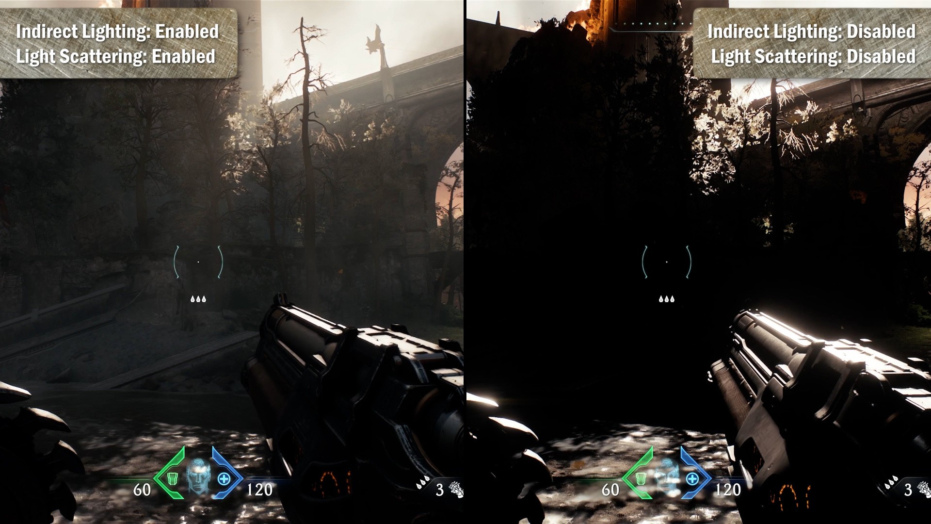 When coupling this with the atmospheric effects, fog volumes and weather, I'd say that id Software achieved its goal. The very first stage takes place during a rainstorm and everything works in tandem to create something that feels unbelievably intense and beautiful. Of course, this needed to extend across the entire environment, so id also introduced a new water surface simulation which allows proper ripples and reactions in bodies of water. I'm a sucker for effects like this - it's nothing new but it's always wonderful to see.
