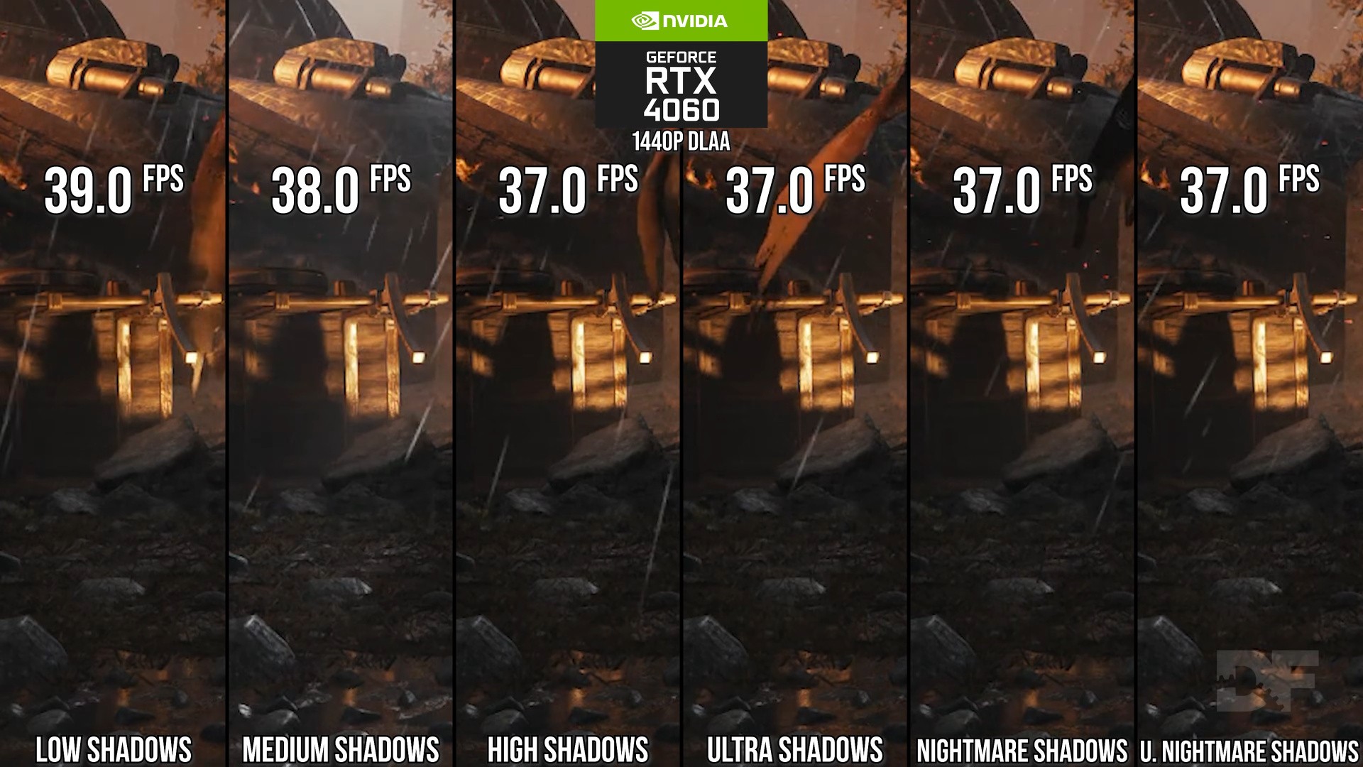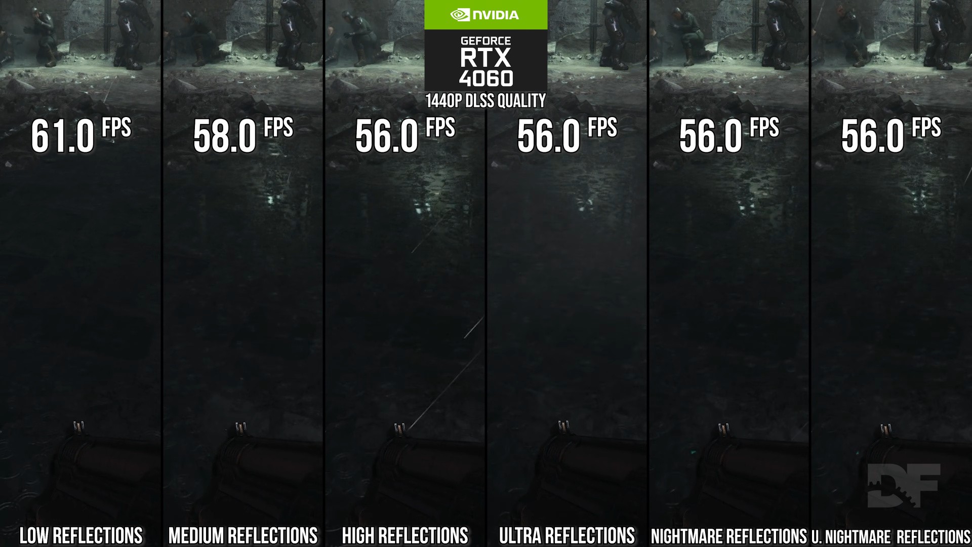 Starting with reflection quality, high, ultra, nightmare and ultra nightmare all look the same and exhibit the same performance figures, as they use half-res RT reflections; medium is one-third-res and low turns RT reflections off as it is on consoles. The low setting makes most sense on low-end GPUs to claw back a touch of performance, while better GPUs can use the medium or high setting. Note that more aggressive upscaling has an effect on how well these sub-native RT reflections integrate into the rest of the image. It's a similar story with shadow quality, with high offering maximum fidelity at present and the medium and low options degrading quality for a slight uptick in performance; take low for low-end GPUs.