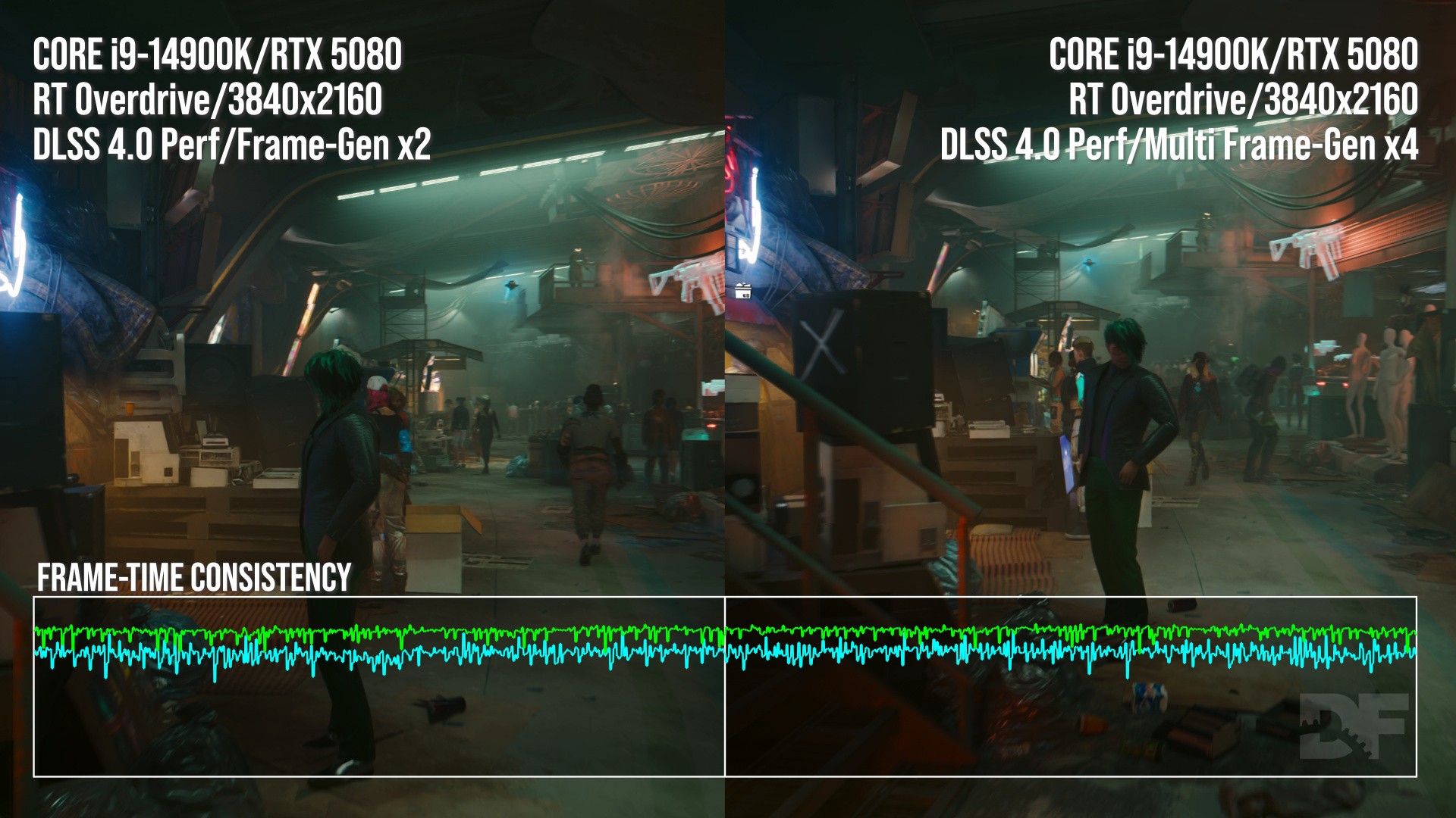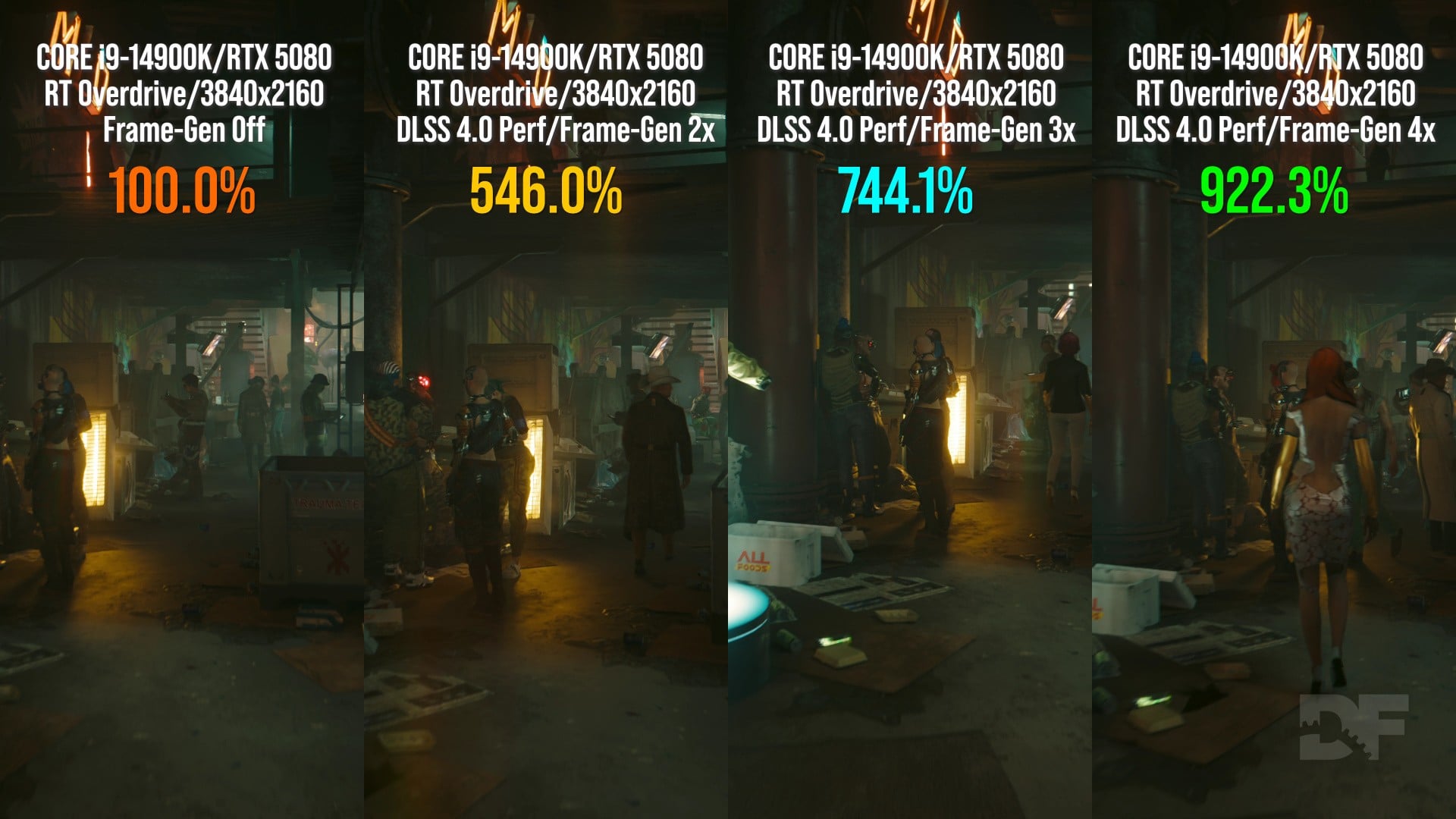 I used the black market in the Petrochem stadium for testing - an area we've previously used for identifying a graphics bottleneck in the console version of Cyberpunk 2077. Running fully unlocked at 4K output resolution with the RT Overdrive path-tracing setting enabled, the existing single frame generation tech combined with the vision transformer model for super resolution and ray reconstruction saw a 535 percent frame-rate multiplier compared to the game running at native 4K resolution. The gains continue as we made more generated frames. Adding two frames sees that rise to 725 percent, while three frames predictably delivers the biggest increase of all - 913 percent vs native resolution rendering.