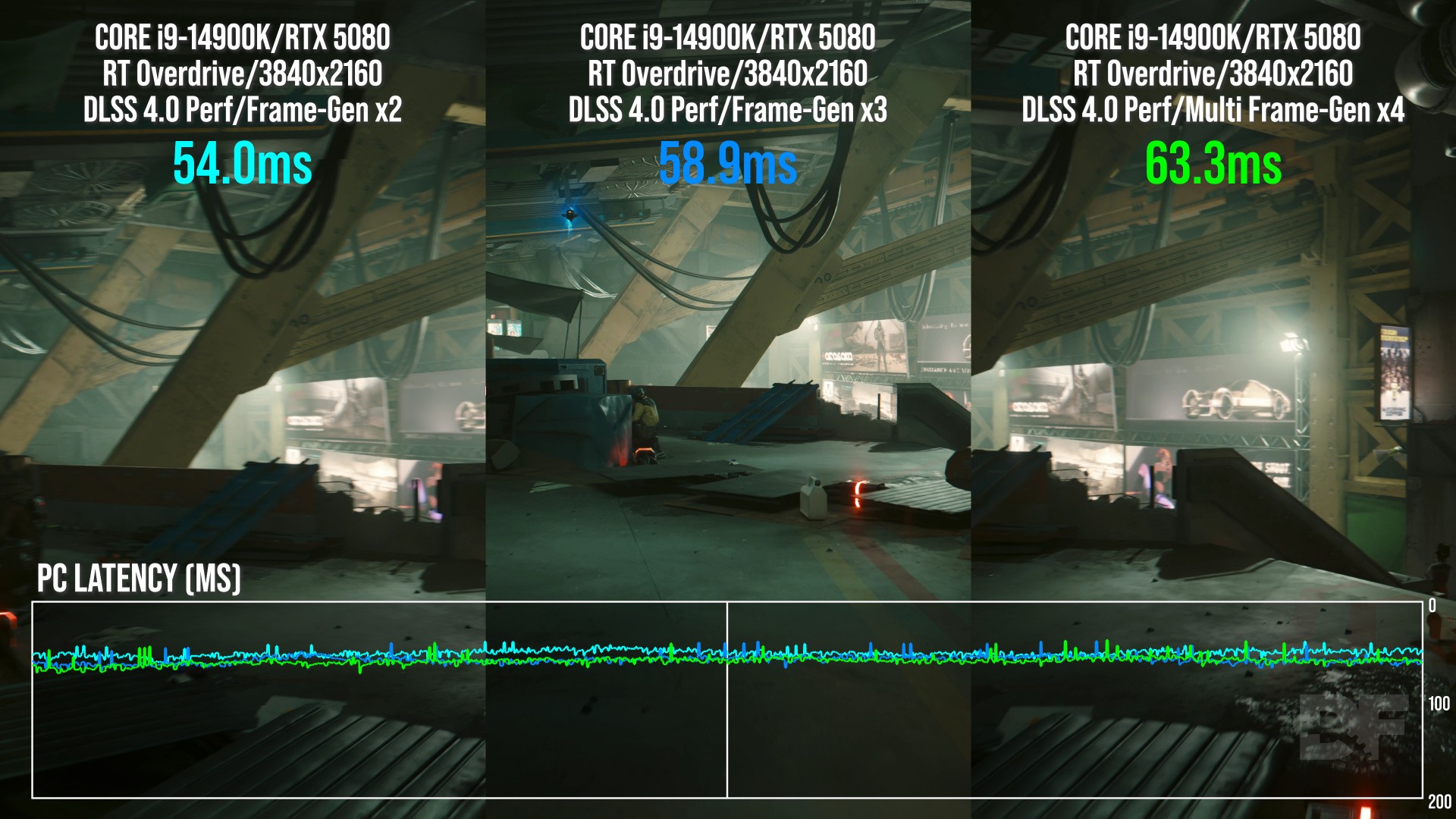 Based on this sample then, we're looking at a 6.4ms average addition to latency with maxed out frame generation in exchange for a 71 percent increase in frame-rate - it's an equitable trade overall. Looking at these results, it seems to me that the majority of the extra latency still comes from buffering that extra frame, but adding further intermediate frames comes with a relatively minimal increase in latency. That means that the gameplay is still responsive in Cyberpunk and unless you're super-attuned to input lag, you're unlikely to tell the difference with the existing DLSS frame generation solution.