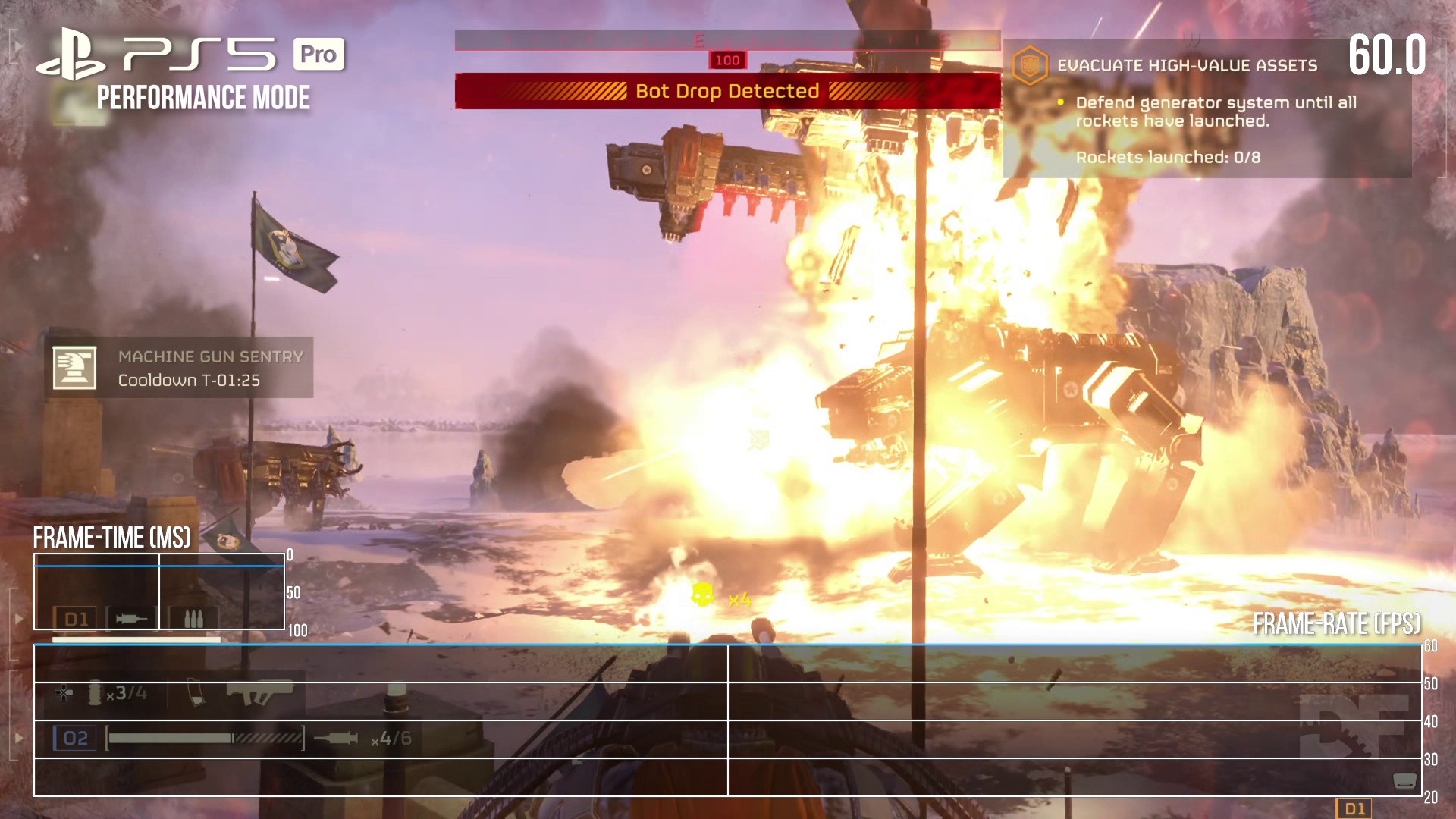 Unsurprisingly, the frame-rates are indeed worse than what we logged last year. On PS5 in performance mode, most of my gameplay in Super Helldive missions is sub-60fps, with long stretches in the 50s and 40s. Sometimes, I'd even clock an extended run in the 30s, with the game clearly struggling to keep pace. The outset of any given match usually runs fine, but more enemy-heavy gameplay later on tends to suffer, with constant frame-rate drops. Lower difficulties present less of a concern, but players who are made of sterner stuff will find the higher challenge levels quite taxing on a base PS5.