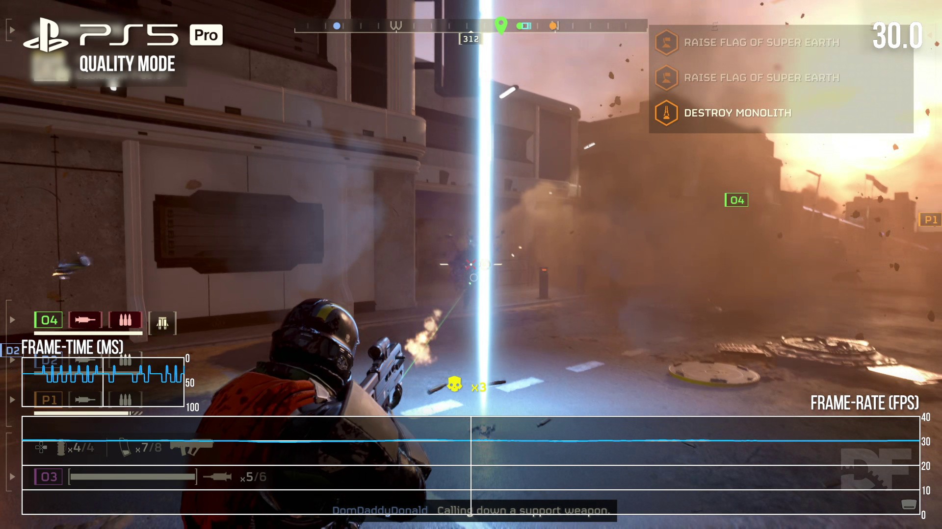 The quality mode is less compelling. Here, the image improvement is relatively slight - not really amounting to much generally speaking, though fine detail resolves more clearly and foliage generally looks better. The rendering setup is again familiar. PS5 clocks in at around 1728p, though with a characteristic sharpness and edge smoothing that makes me think it's using FSR 1 as an upscaling solution. PS5 Pro takes the brute force approach instead, pulling off a full native 4K image. It's not a perfect solution as the Pro can still struggle with depth of field, and doesn't deliver a perfectly stable rendition of all geometry - but it does have an edge over the base machine. Again, to see better results still we'd have to see some revision of Helldivers 2's anti-aliasing technique. Performance? Even on PS5 Pro, the same frame-pacing issues we saw at launch are present.
