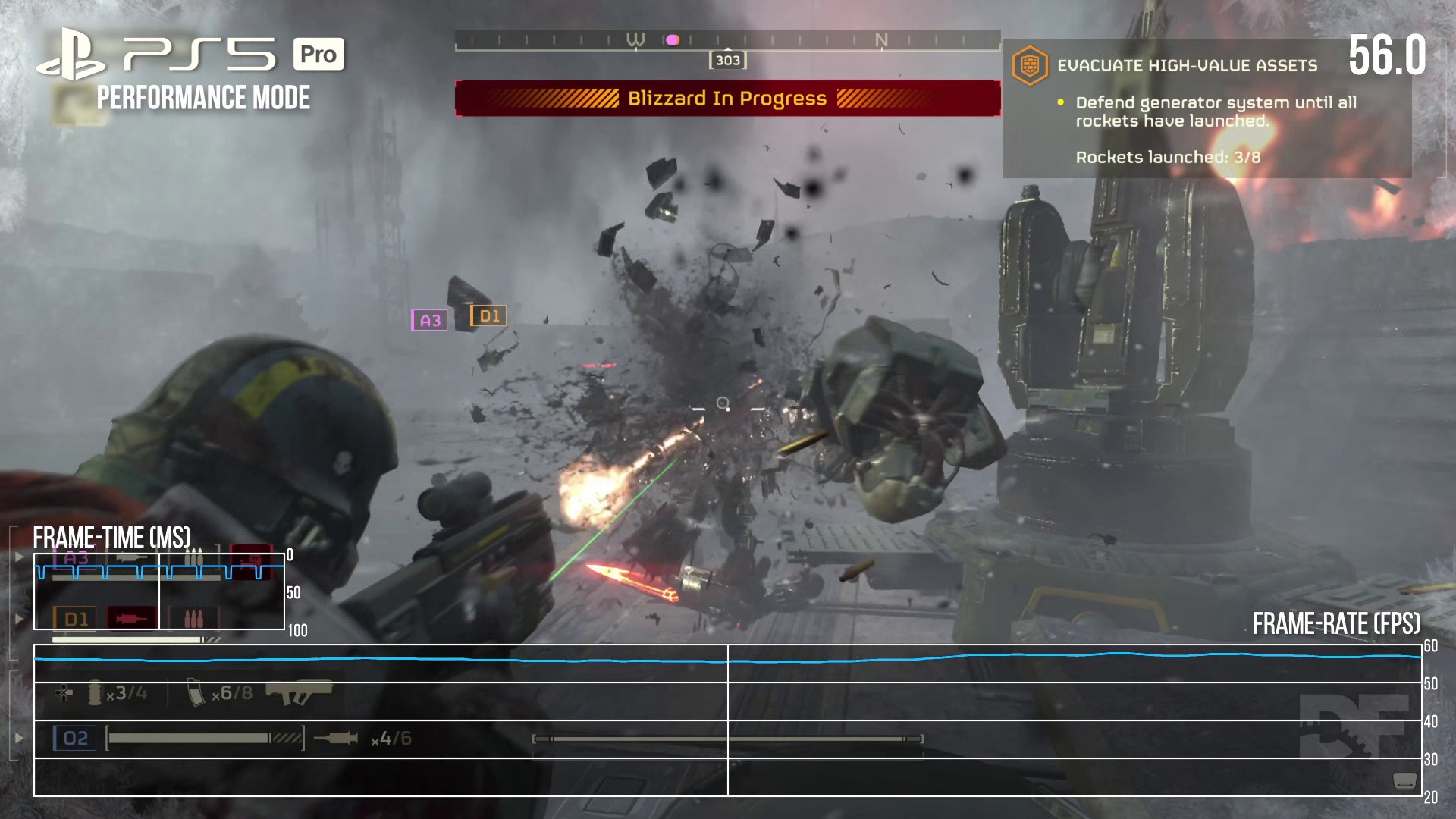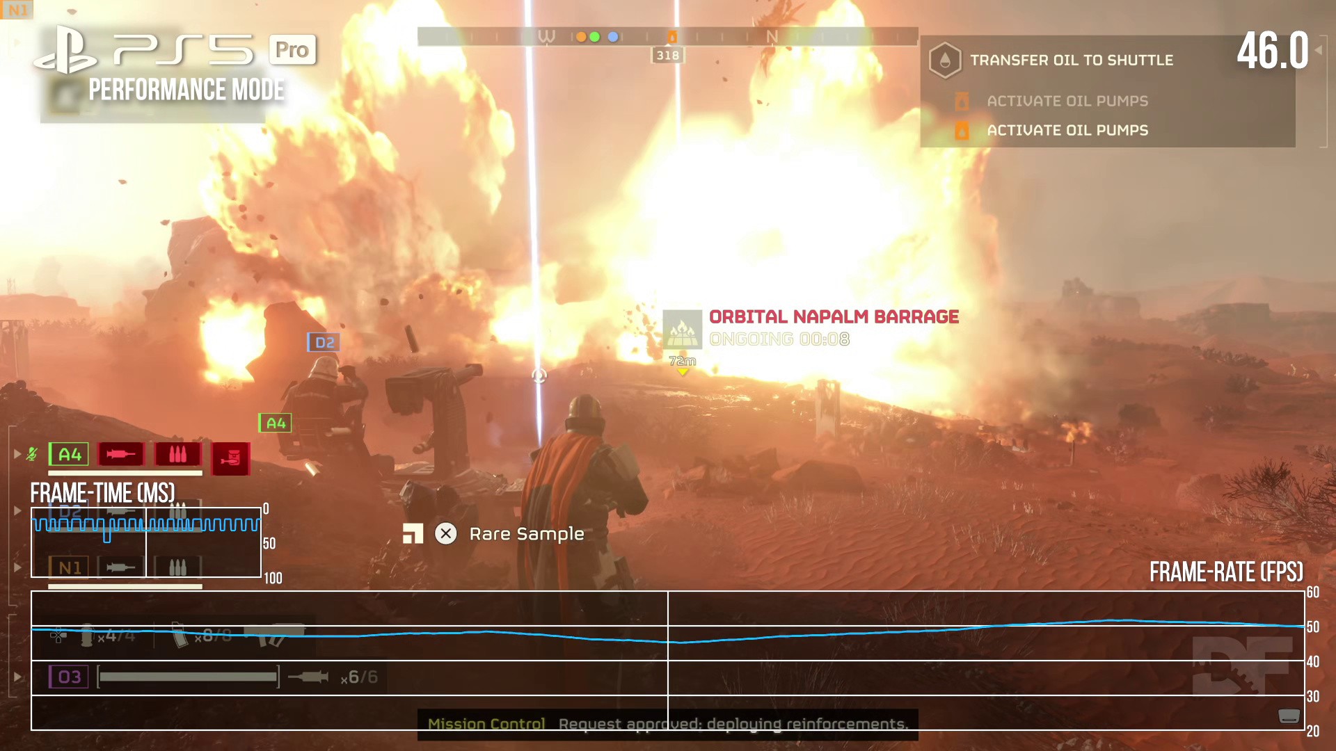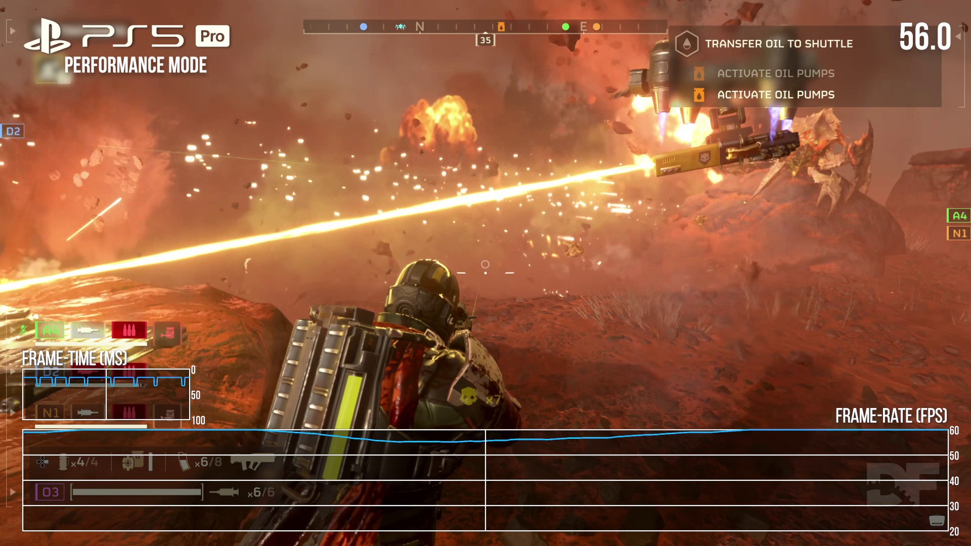PS5 Pro has a lot of similarities. Helldivers 2 does like to spend a good amount of time in the 40s and 50s here in more challenging endgame content but generally speaking, it doesn't seem to dip quite as hard in its worst moments - I didn't spot extended gameplay in the 30s, for instance, despite playing quite aggressively. I did notice brief stutters at one point as well across a few hours of capture. Of course, it's virtually impossible to match content across my capture sessions, given the hectic multiplayer-oriented nature of Helldivers 2. However, my general impression is that the performance level is indeed higher on the Pro machine. It does a better job of sticking within a reasonable frame-rate window and is more often compatible with the PS5 Pro's VRR range. The game doesn't support 120Hz output on PS5 or Pro, so you're limited to 48fps and above to get VRR smoothness.
