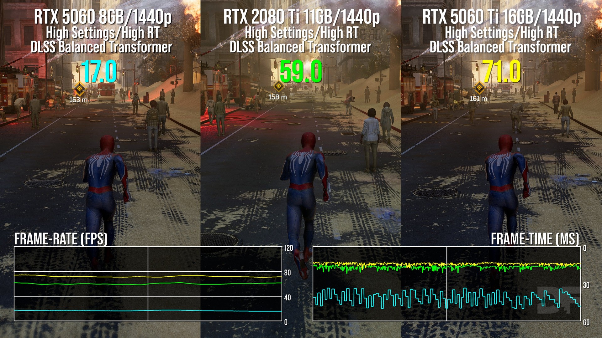 The RTX 2080 Ti also seems to answer the question of how much VRAM is appropriate for a card of this class. Even at 1080p resolution, we can find examples of the RTX 5060's 8GB of framebuffer memory falling short, but looking at Marvel's Spider-Man 2 and Monster Hunter Wilds specifically as examples, it highlights that while the raw horsepower is there to produce decent frame-rates with ray tracing active, you need more than 8GB to get the job done. While 12GB is more common, 11GB seems enough to make these games run well and to ace our benchmark suite where the RTX 5060 falls short.
