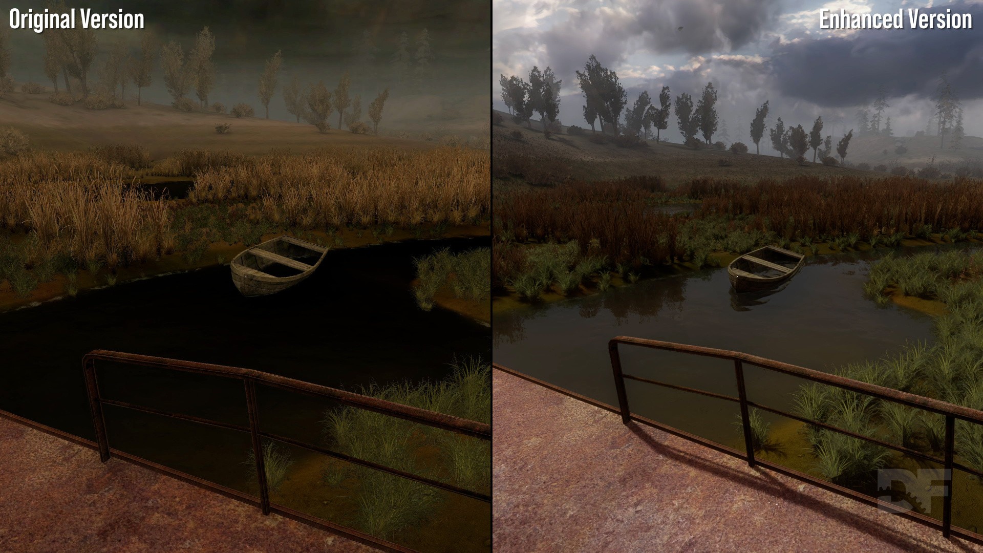 Next, in terms of actual in-engine gameplay, the improvements are also clear. The existing PC - and indeed PS4 and Xbox One versions from last year - already use upscaled texture assets, and so the enhanced version does little to move the needle in this respect. One standout improvement though is in screen-space reflections - SSR - which add a more detailed mirror image to water bodies. Previously, the official release used basic cube map textures for reflections, but SSR goes a long way to fleshing out the mirror image on lakes and rivers. There's no ray tracing, but it's a step forward that rolls out to the PC update as well. Secondly, broad views of the game's landscapes reveal a huge increase in foliage, geometry and shadow draw distances. The broadened LODs here minimise the visibility of pop-in, especially now we're playing at resolutions of up to 4K and beyond. The addition of improved GI also affects the indirect shadow and light bounce around trees, simulating a thicker, richer shade across the world - and the small pockets of space around the gun and player's hand. All of this, again, goes beyond what's possible in the official PC build maxed out, before the enhanced edition upgrades.