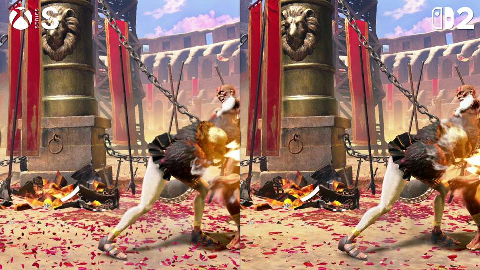 Even heavy motion tends to favour Switch 2. Noise across materials like Zangief's glossy spandex outfit are cleaned up, while hair - like Dhalsim's beard - feature fewer dithering artefacts. Hair elements are sadly still prone to obvious noise, and this remains an area of weakness for Capcom's RE Engine in general, but it is minimised at least on Nintendo's platform. Of course, PS5's 4K image sets the gold standard in side-by-side shots, but the fact that Switch 2 is outperforming Series S is a huge win in itself.