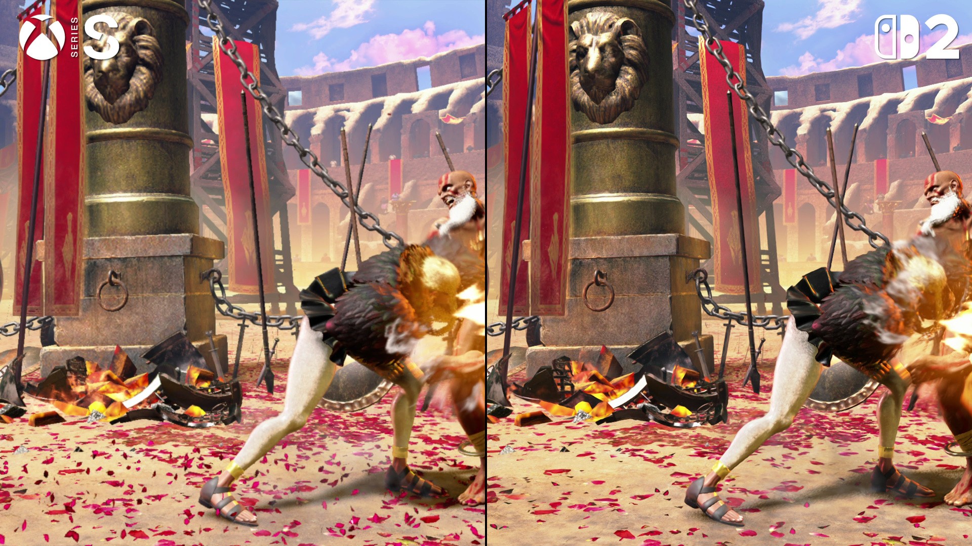 Despite the relative success in image quality next to Series S, it's impossible to ignore certain other visual tweaks on Switch 2. The good news is that Switch 2's texture quality is superior to Series S, with skin, clothing, and stage floors boasting higher-res texture maps despite a narrow 9GB to 8GB VRAM lead. Everything from Chun-li's qipao to the pores on each character's face show a huge disparity in asset quality.