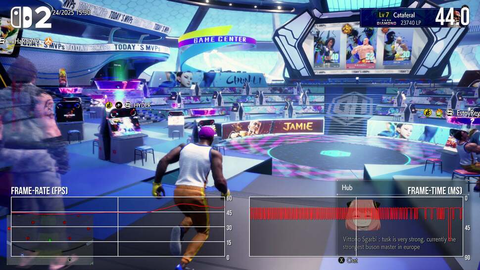 Less impressive is the state of the World Tour mode. Performance is sadly an after-thought in this case, with travel around the city running entirely unlocked on Switch 2. Cutscenes and free roaming run at 30-60fps which never feels great, especially without VRR support available to TVs in docked mode. Worse still, any encounter with enemies takes you to a side-on battle view, which caps all play to 30fps. It's entirely at odds with Street Fighter's historical focus on 60fps play: you get a jarring transition in refresh, and to compound the issue, that 30fps cap has occasional moments of uneven frame-pacing. Alas, the Battle Hub mode falls prey to the very same problem in its roaming, with a 40-60fps read-out causing judder, especially on busy servers.