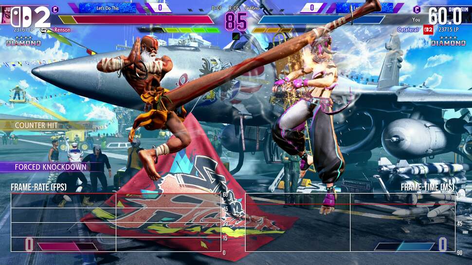 Back to the good news: testing Street Fighter 6's frame-rate is as straight-forward as can possibly be. Switch 2 achieves a perfect 60fps lock in the Fighting Ground mode, with Capcom making the right call in prioritising performance over all else. Each frame is crucial, with all 60fps forming an integral part of the Street Fighter 6's internal logic in timing an input, blocking, or parrying. In docked play the visual cutbacks pay off to keep that 60fps consistent, and likewise - judging by eye, owing to a lack of direct capture for frame-rate analysis - portable play on Switch 2 is similarly robust. The only exception is the brief drops to the mid-40s during the (non-interactive) pre-fight hype sequences, which has no bearing once actual gameplay begins.