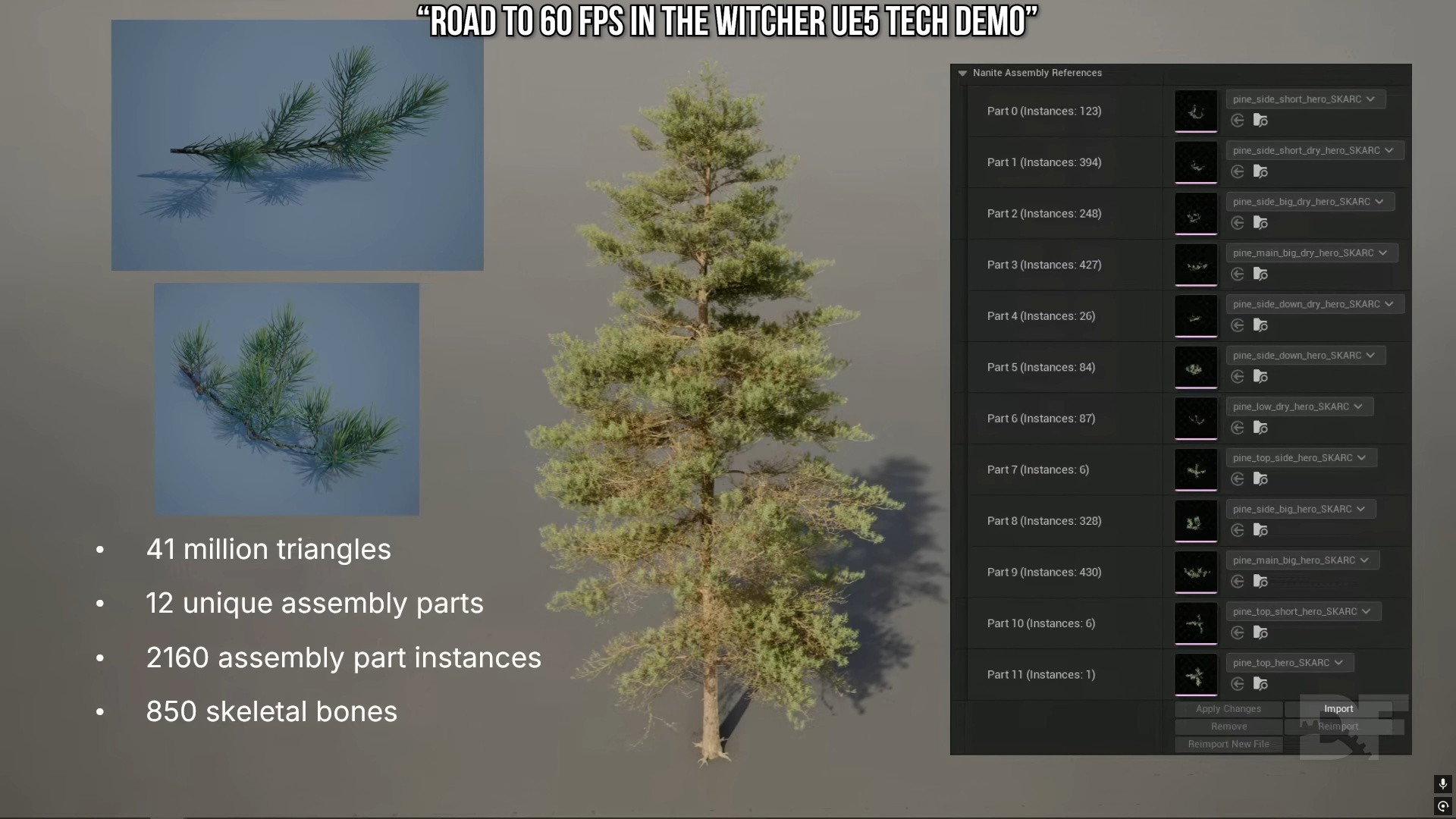 Charles Tremblay: The reason we had the pine tree is because we thought it was the worst case scenario, and we worked on it for a long time. I was super stresed when we started work on the demo, and we had to consider also the asset space on disk, all the assemblies... In The Witcher, the forest is the soul of the game, so it couldn't be done the traditional way.